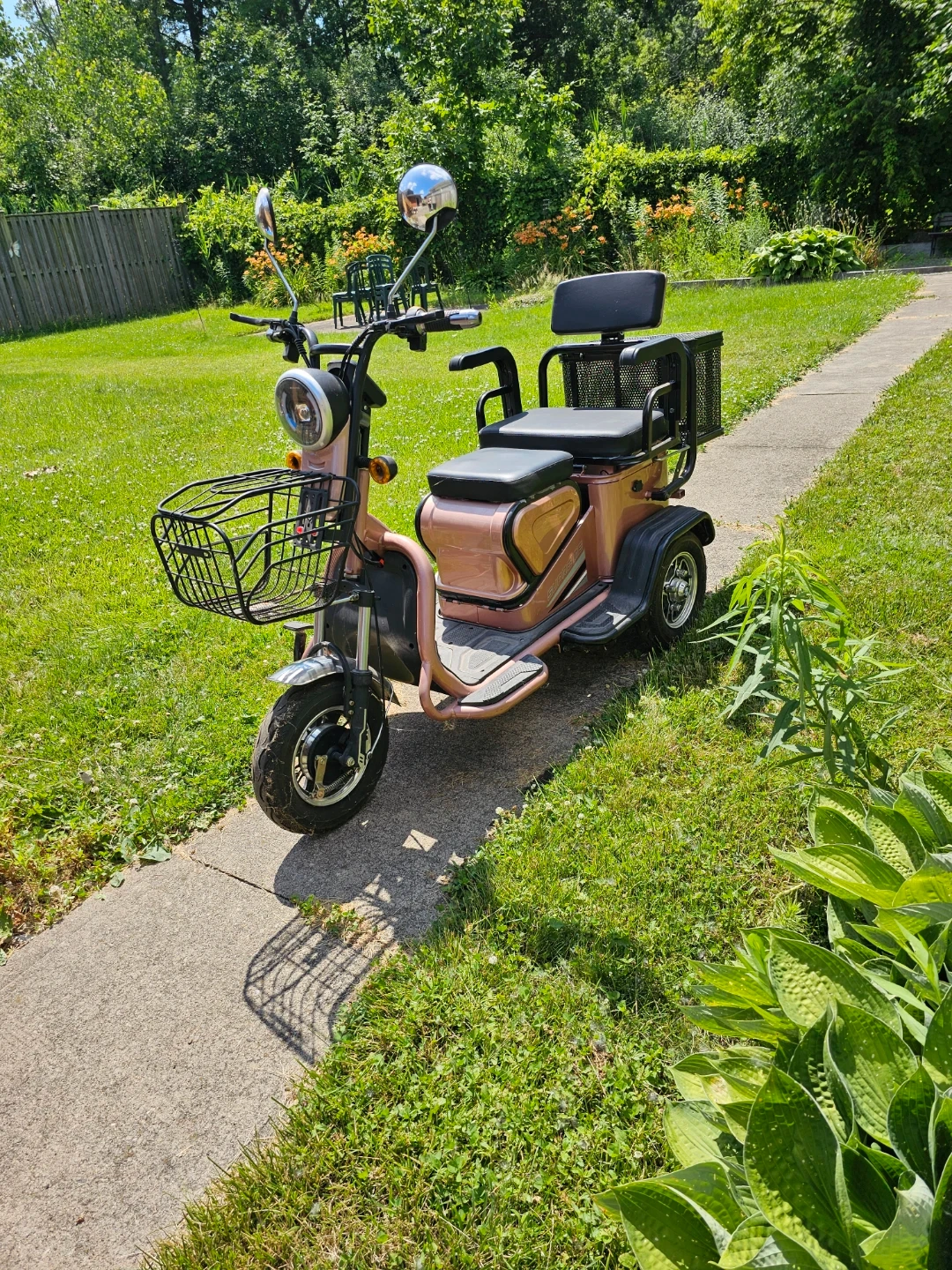 This is a rose gold 3-wheel mobility scooter with a front basket and rear storage basket. It has a dual seat for two riders. This scooter is great for getting around easily and comfortably. It features a stylish design and ample storage space for your convenience!