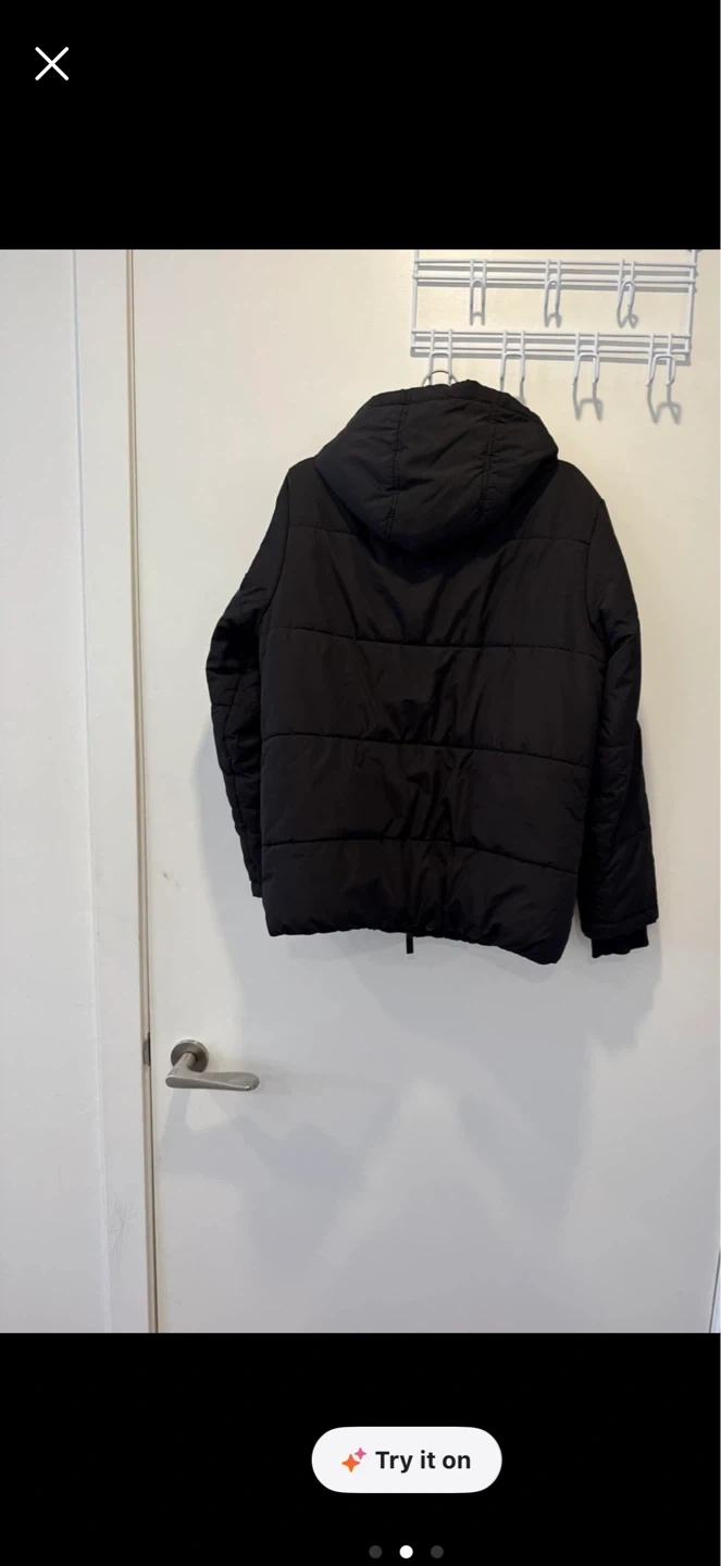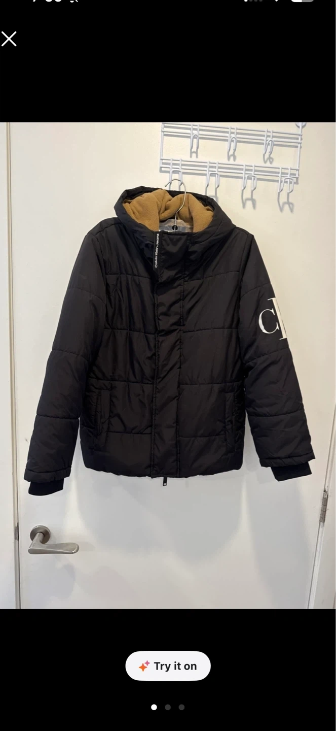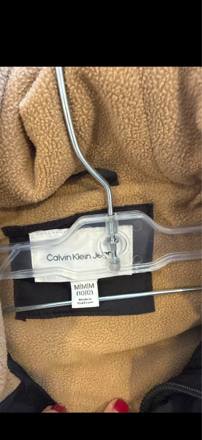 Black Calvin Klein Jeans puffer jacket with a tan sherpa-lined hood. Tagged M (10/12). Made in Vietnam.