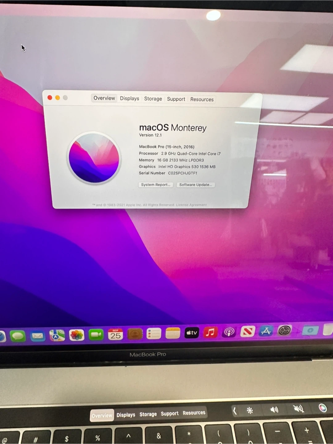 10Selling a MacBook Pro (15-inch, 2016) with macOS Monterey version 12.1 - Processor: 2.9 GHz Quad-Core Intel Core i7 - Memory: 16 GB 2133 MHz LPDDR3 - Graphics: Intel HD Graphics 530 1536 MB - Storage: 1TB Flash Storage - Built-in Retina Display: 15.4-inch (2880 x 1800) - Battery Condition: Normal
