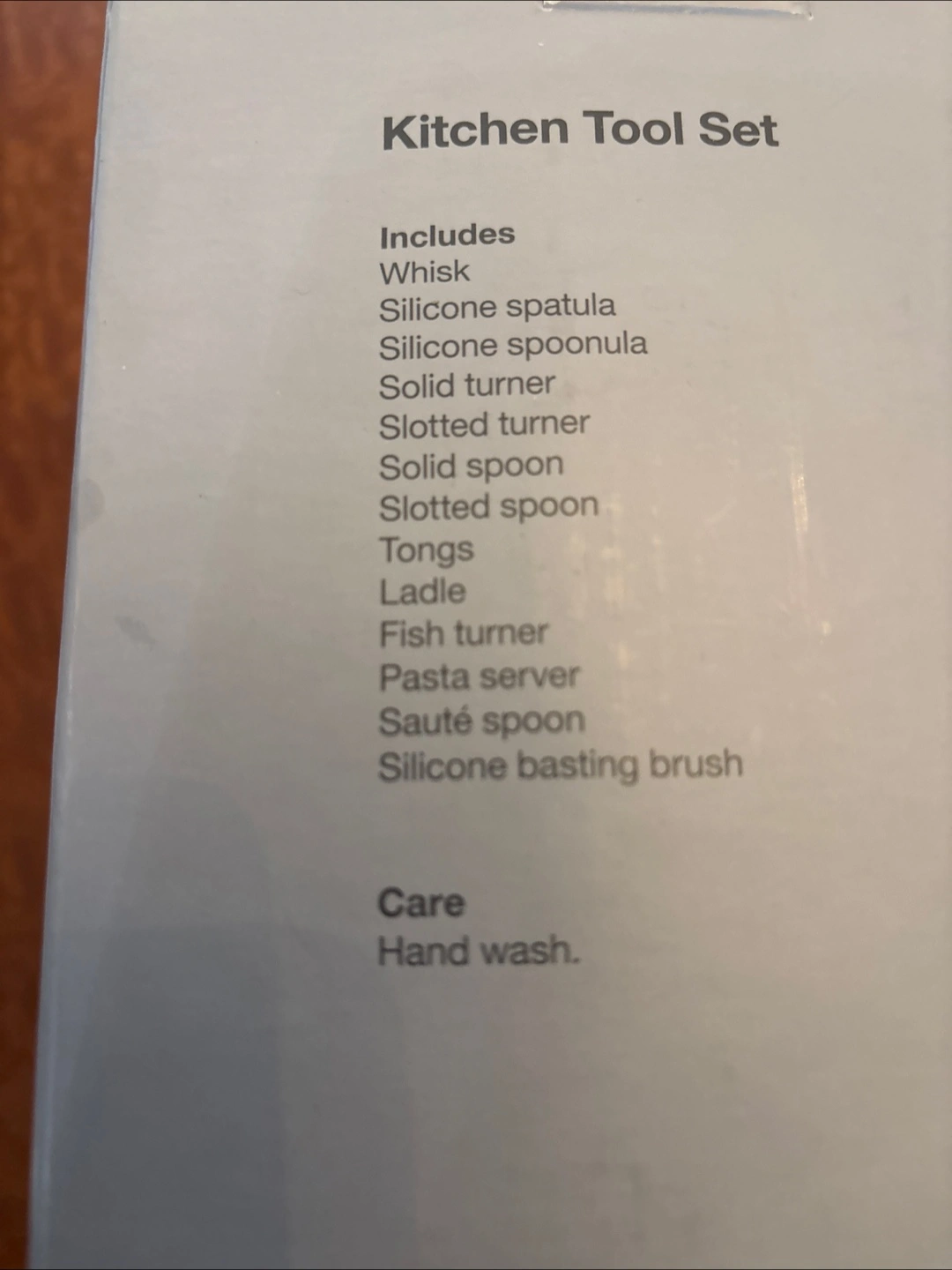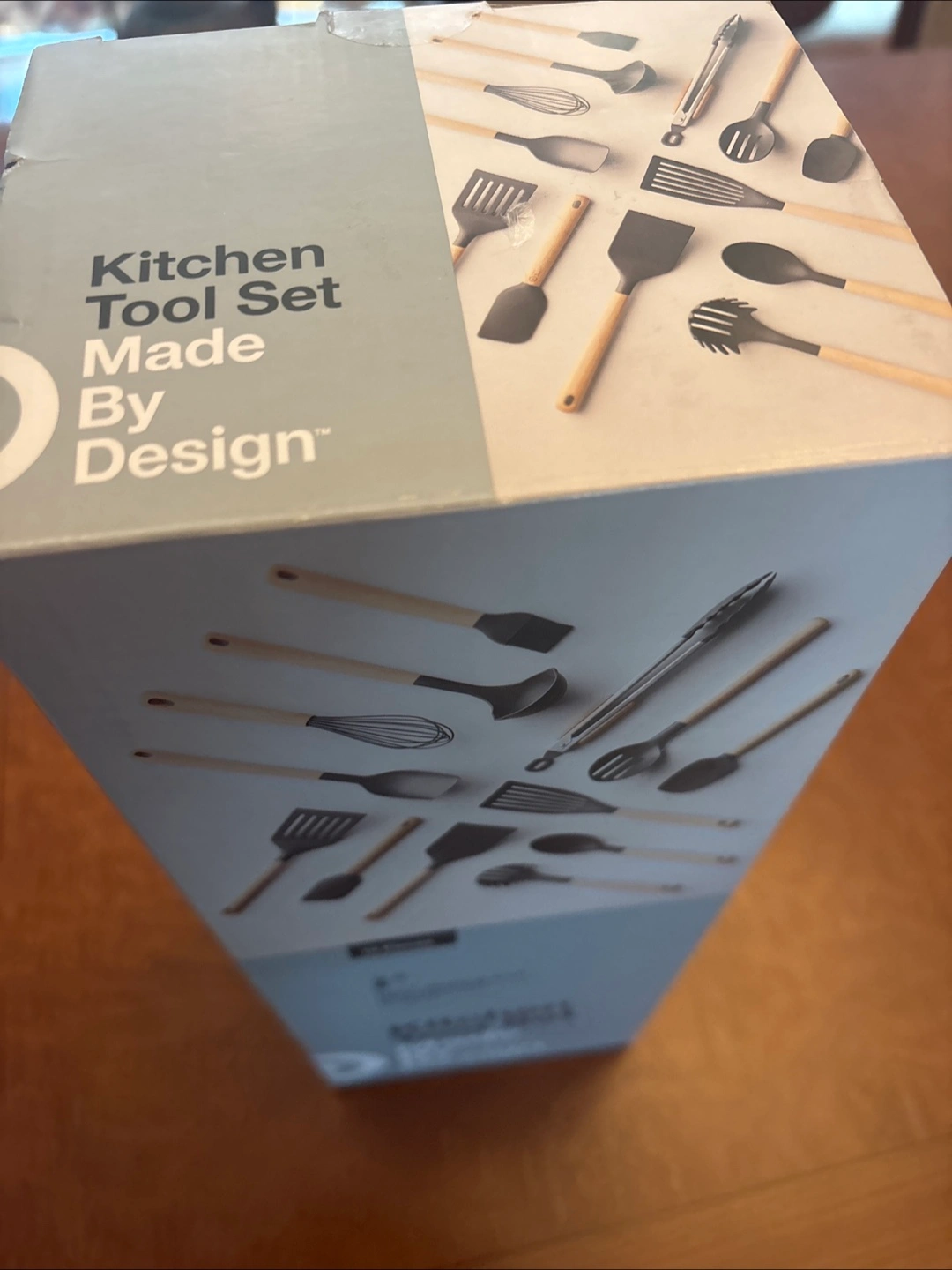 277Selling a new in box complete 13-piece kitchen tool set from Made By Design! The set includes a whisk, silicone spatula, silicone spoonula, solid turner, slotted turner, solid spoon, slotted spoon, tongs, ladle, fish turner, pasta server, sauté spoon, and a silicone basting brush The nylon working ends are heat resistant up to 450°F, and the box is included