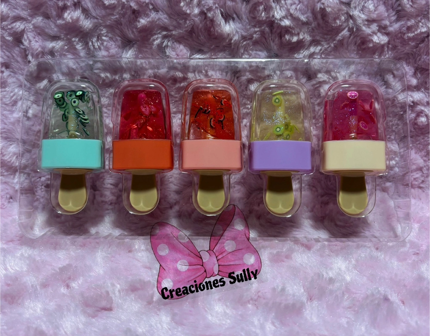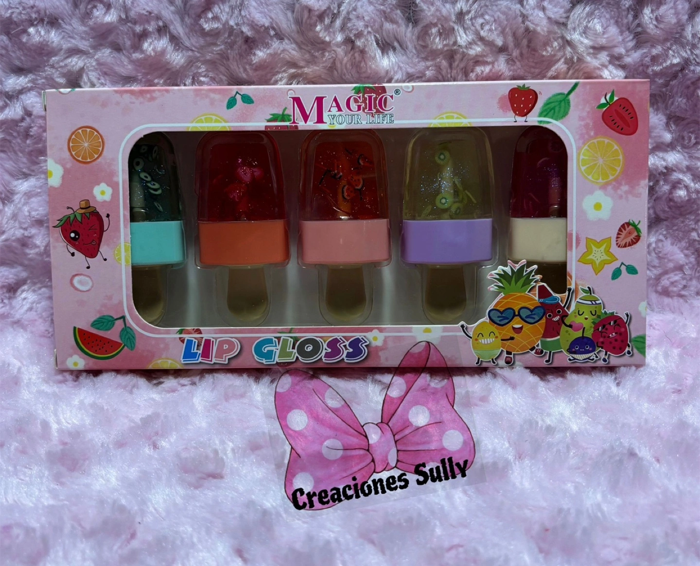 I am selling a fun lip gloss set. There are five different popsicle-shaped lip glosses. The set is fruit-themed with fun colors. Applying this will bring a little joy to your day.