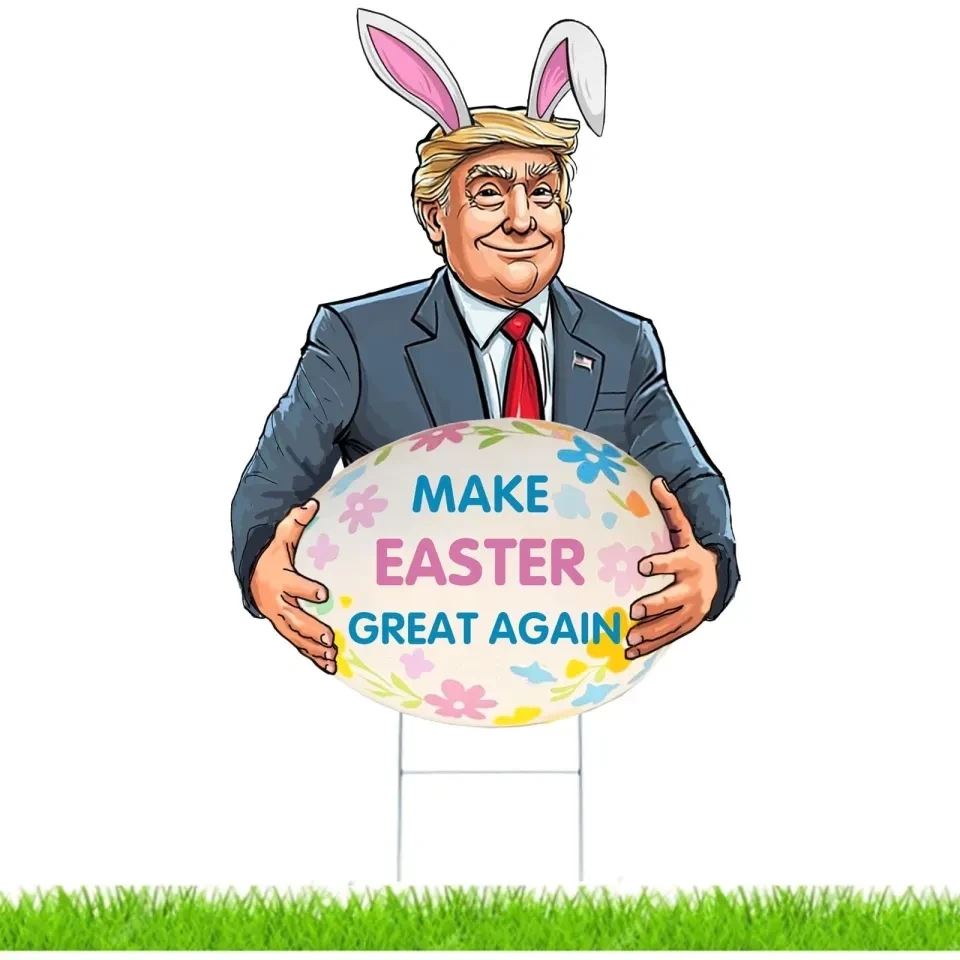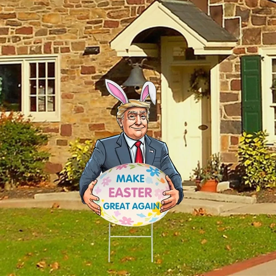 A sign for Easter. Features an illustrated image. Shaped like an egg. Perfect to display on your front lawn to enjoy. $15 each couple available