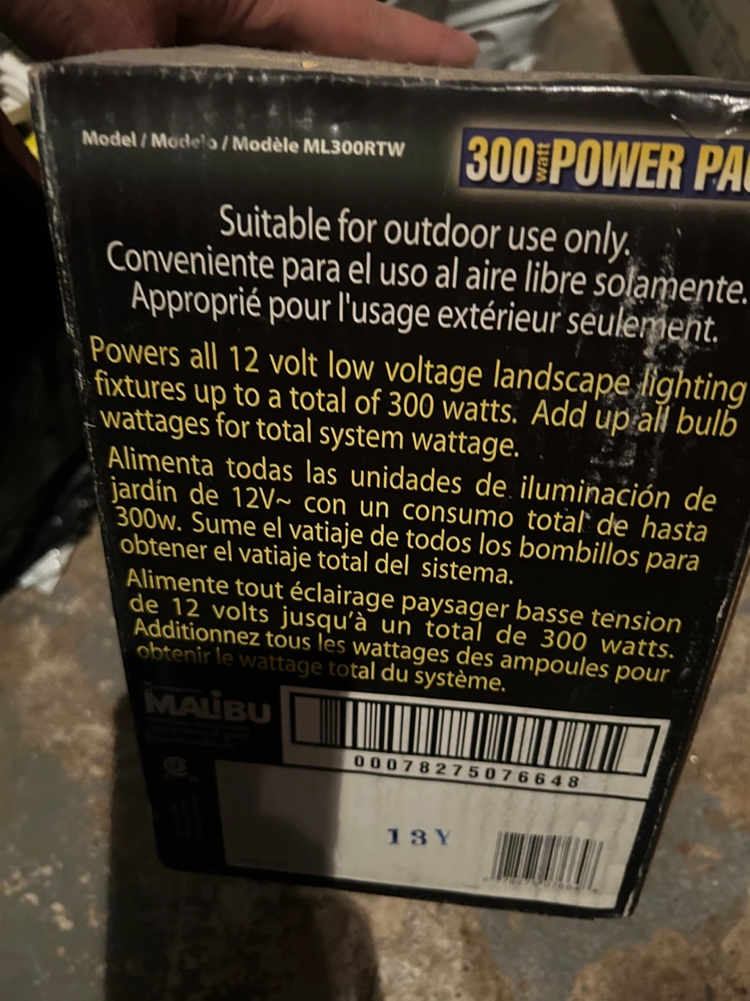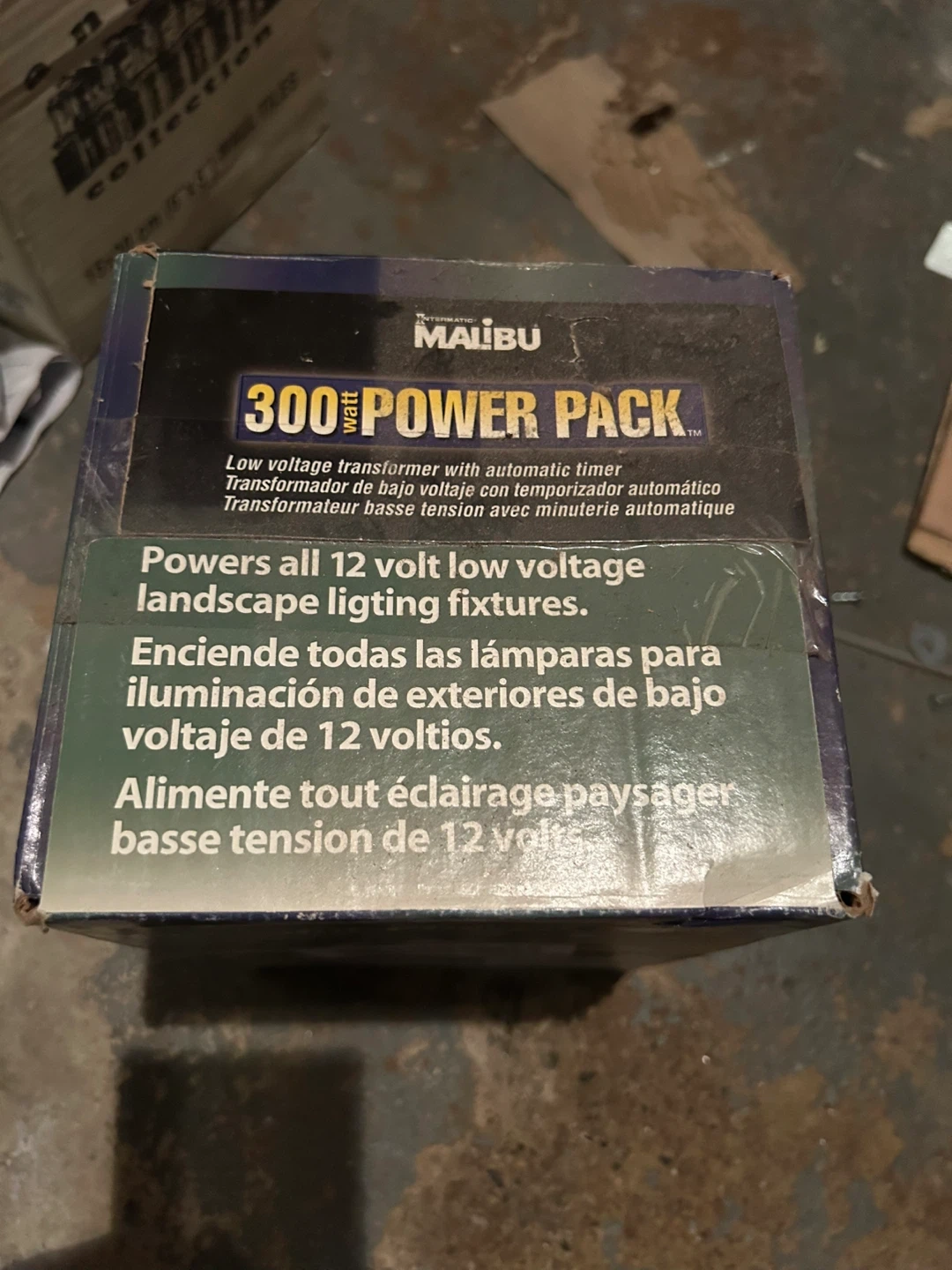 Selling a Malibu 300W Power Pack low voltage transformer with automatic timer. It powers all 12 volt low voltage landscape lighting fixtures up to a total of 300 watts. Suitable for outdoor use only. Model ML300RTW