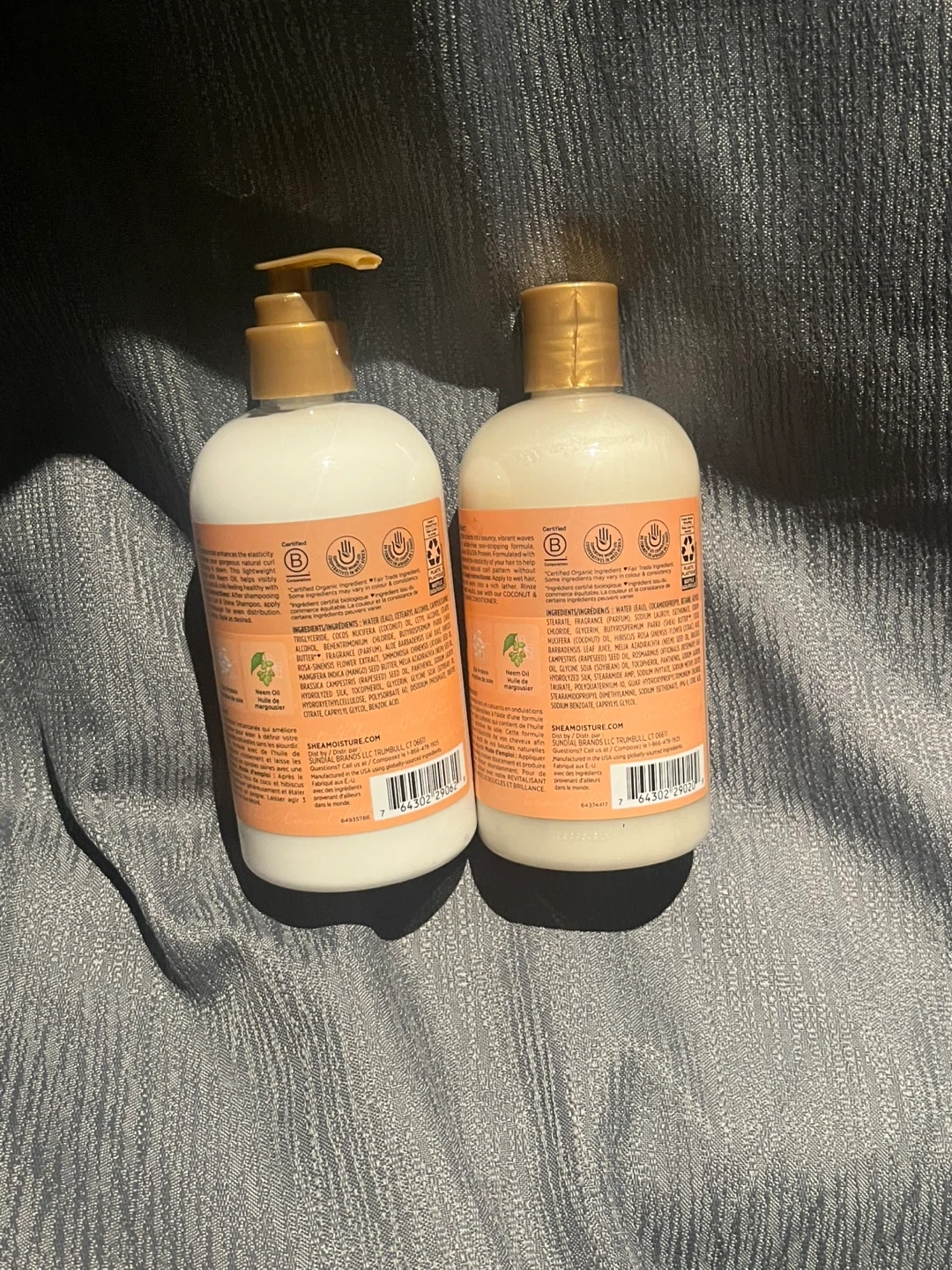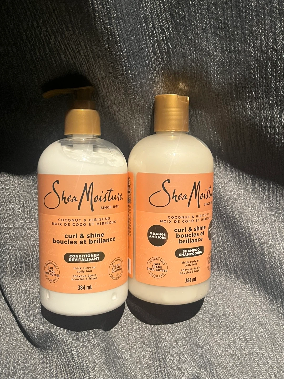 This set includes Shea Moisture's Coconut & Hibiscus Curl & Shine Shampoo and Conditioner. Both bottles are 384 mL. They're formulated for curly hair.