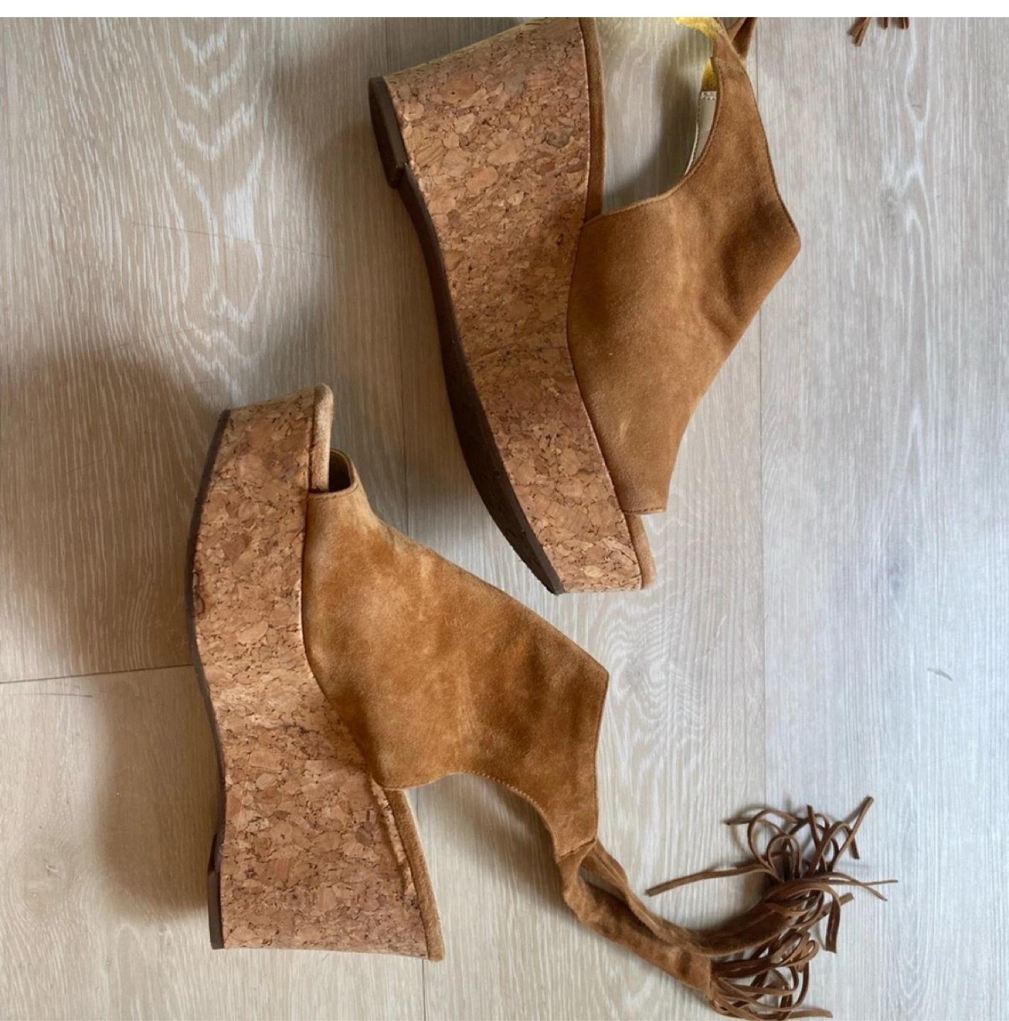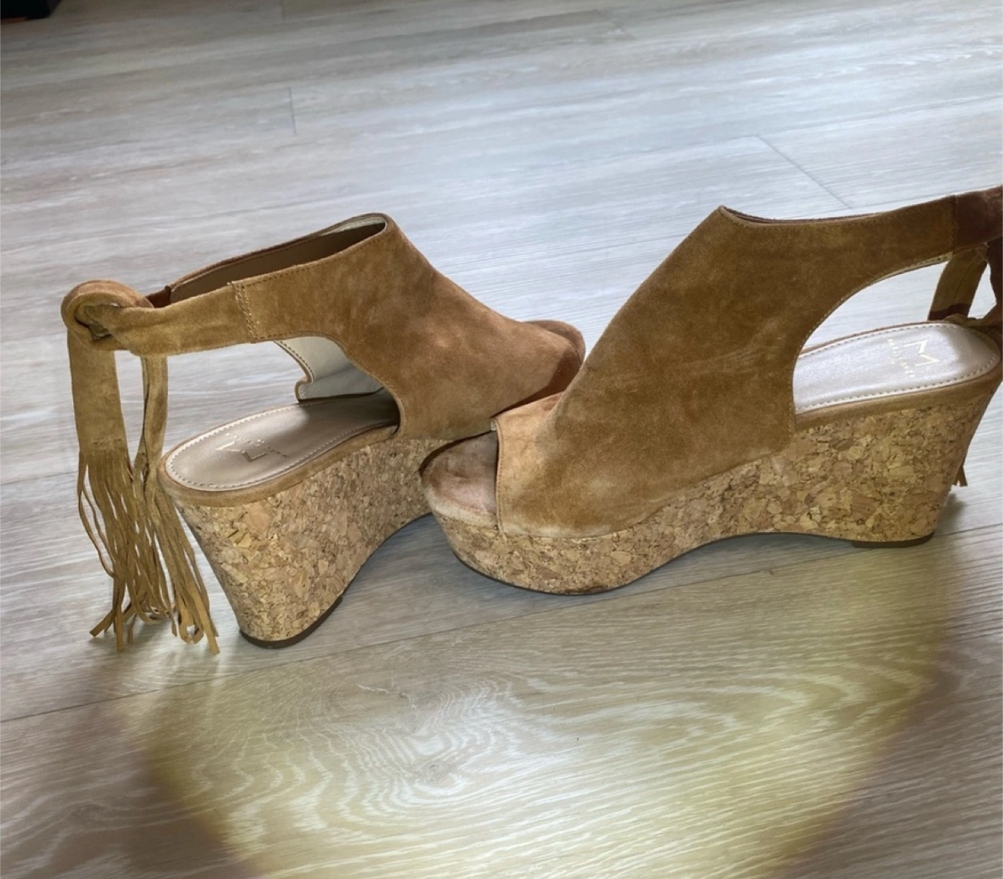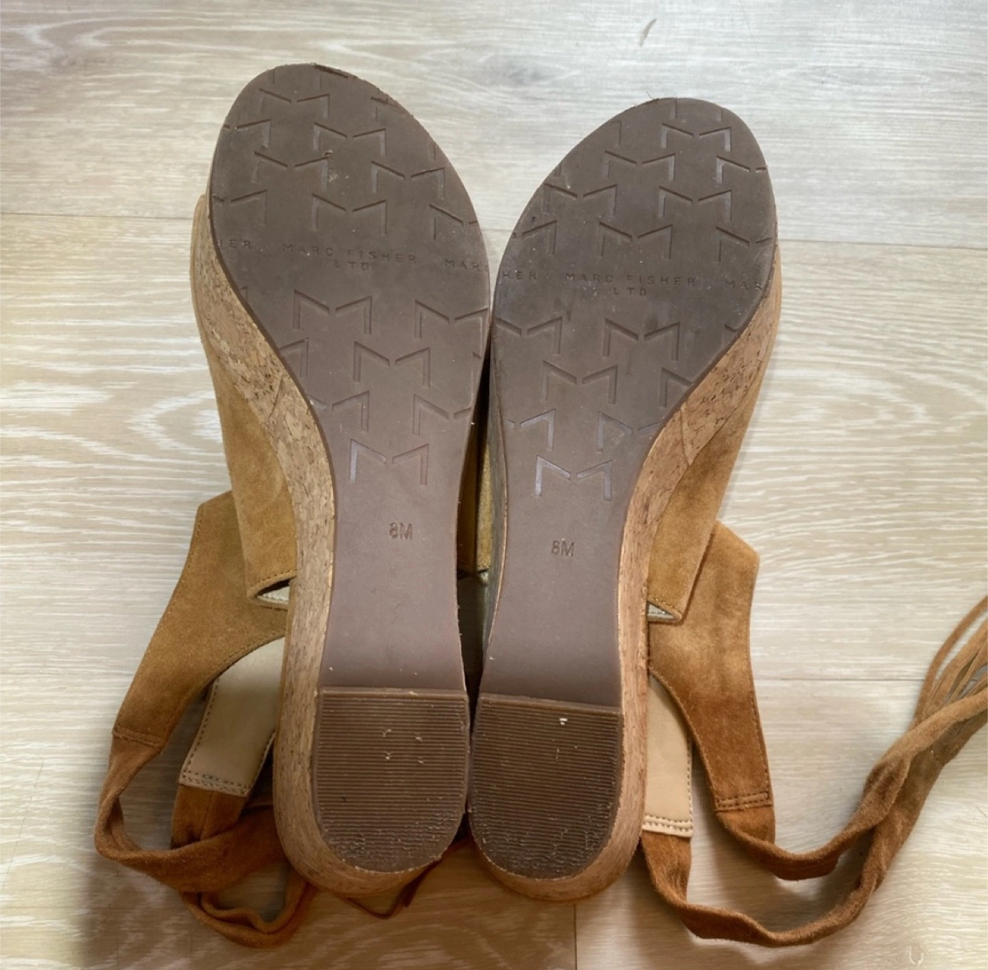 These are Marc Fisher wedge sandals in a size 8. They feature a suede upper and a cork wedge heel. They have a cute tie detail with tassels. Perfect for a casual or dressy look!