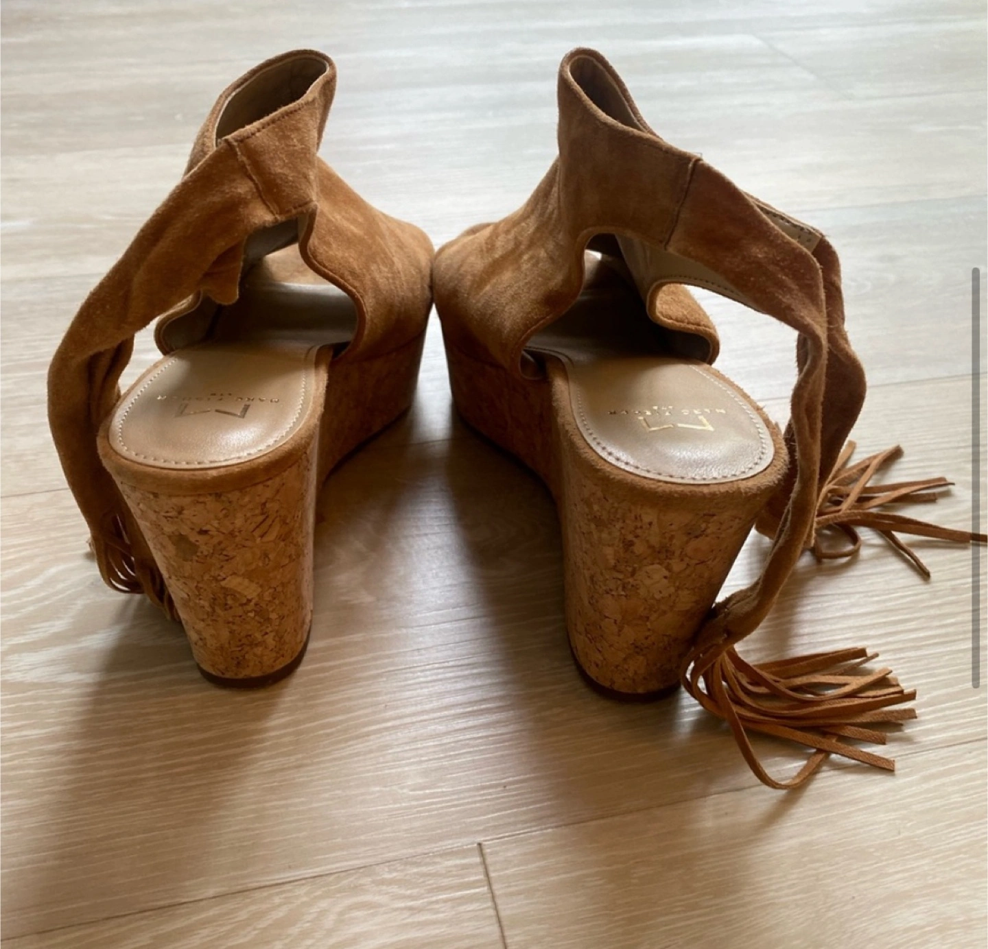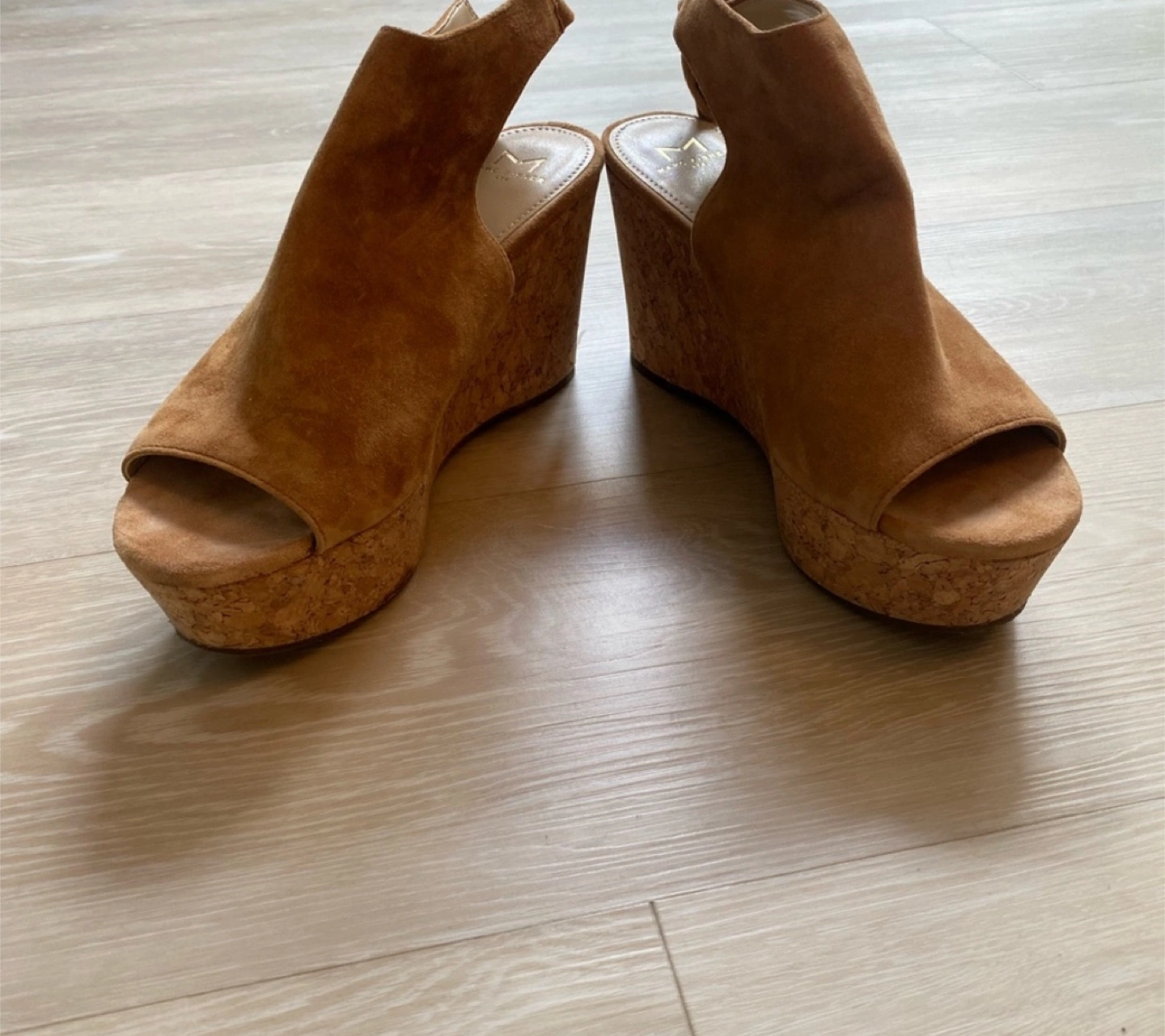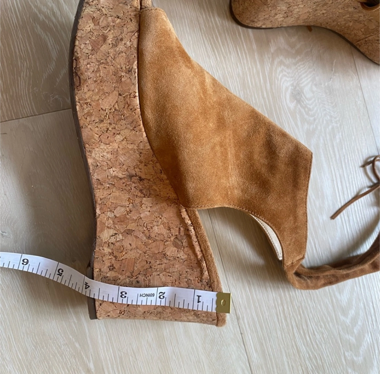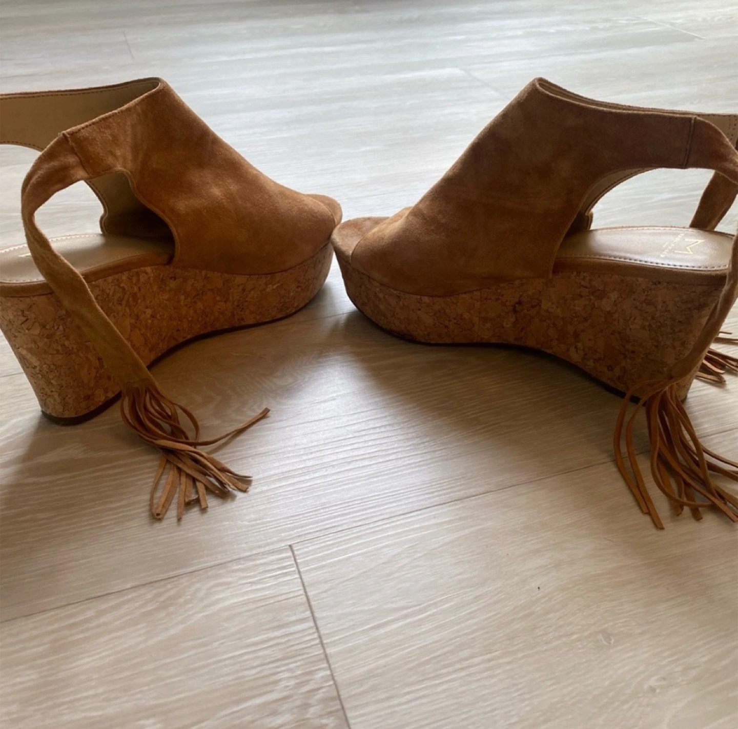 These are Marc Fisher wedge sandals in a size 8. They feature a suede upper and a cork wedge heel. They have a cute tie detail with tassels. Perfect for a casual or dressy look!