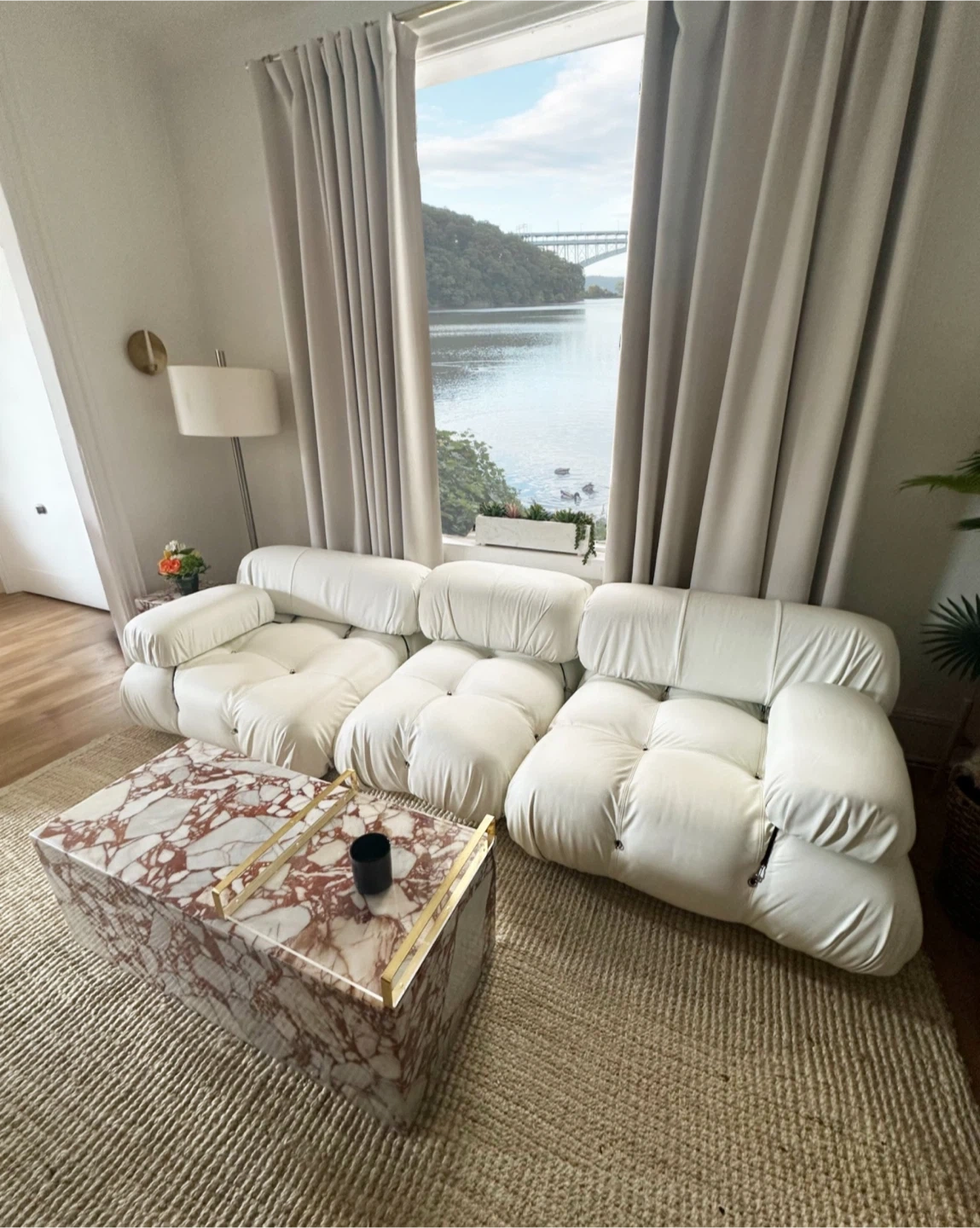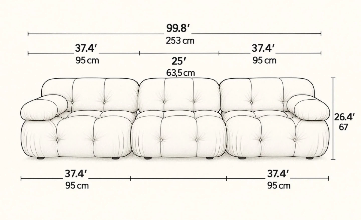 Selling a beautiful Mario Bellini Camaleonda style sofa in white leather. This iconic modular sofa is in great condition and ready to add a touch of mid-century modern style to your home. It's a comfortable and versatile piece that can be arranged in various configurations to suit your space. Each module is 37.4 inches (95 cm) wide, and the total length of the three modules is 99.8 inches (253 cm).