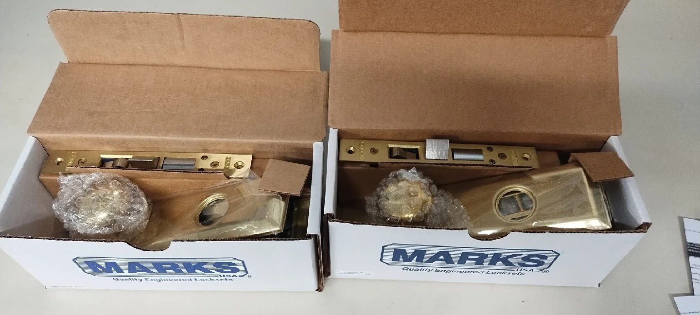 68I'm selling two MARKS USA Apartment Entry Heavy Duty Mortise Locksets, model 114A/3. One is LH (left-hand) and the other is RH (right-hand). They feature polished brass, a backset of 2-1/2", and a deadbolt of 1". The front measures 1-1/16" x 7-5/8". Each set includes knob plate assemblies, screwless knobs, self-adjusting spindles, a solid brass cylinder, and 2 keys. They also feature a lifetime mechanical warranty. The boxes are included!