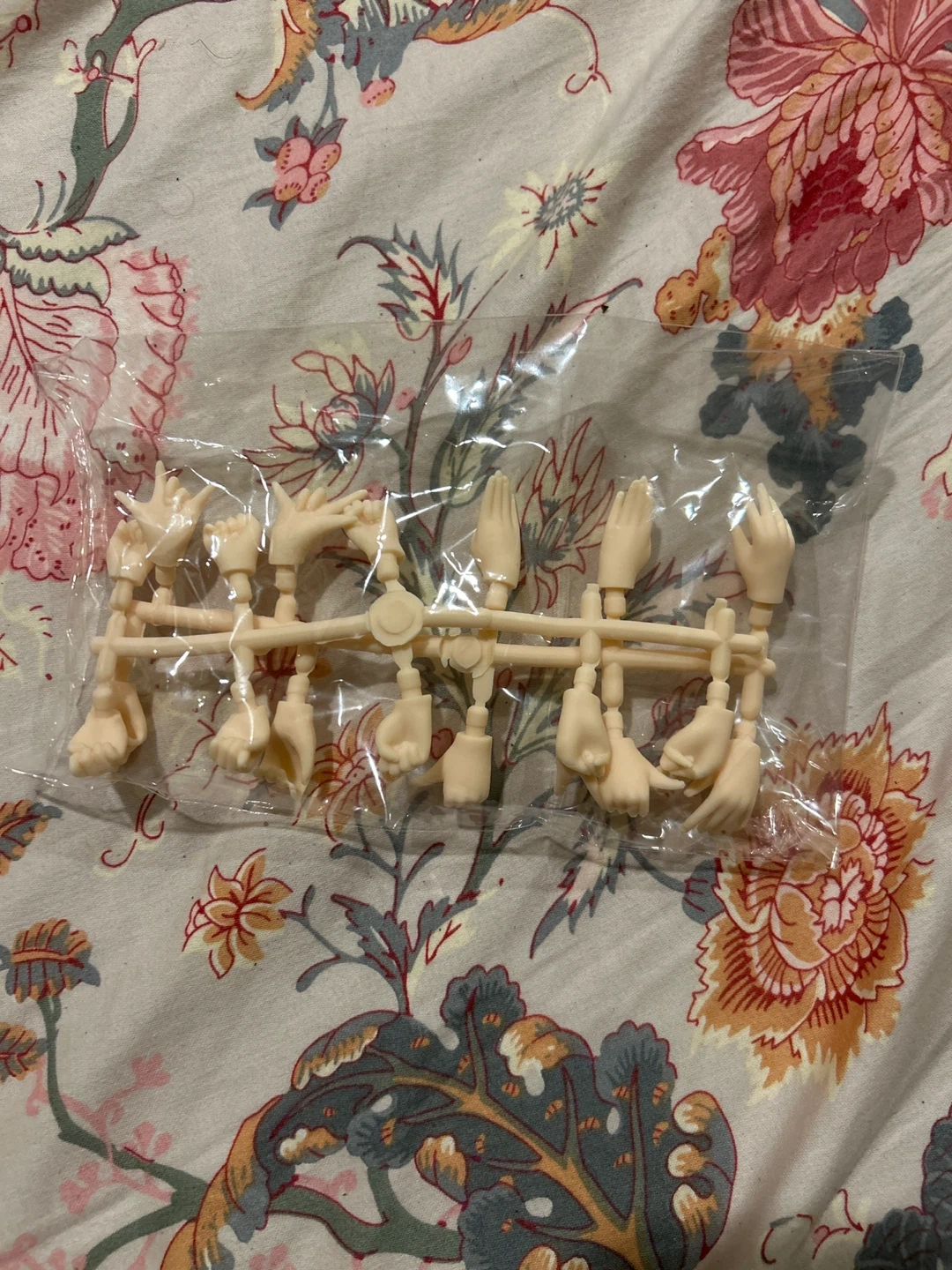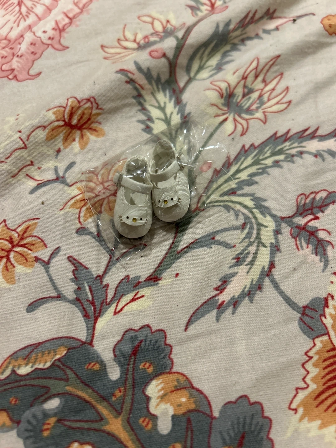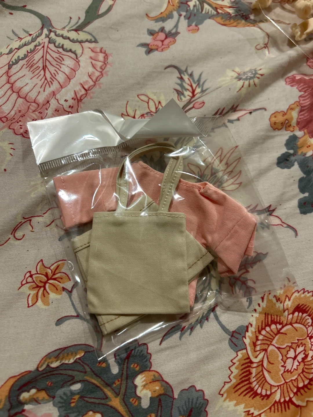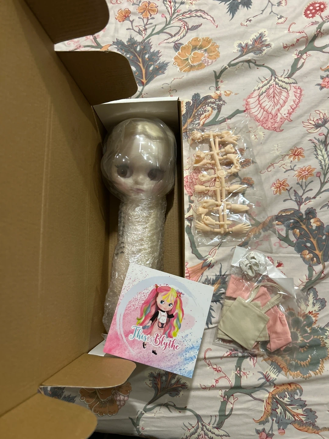 Includes a Blythe doll with blonde hair and a complete set of accessories. Components include various interchangeable hands on a sprue, a pink outfit with a tan bag, and a pair of white shoes with cat accents! (This is written with AI but it’s all accurate)