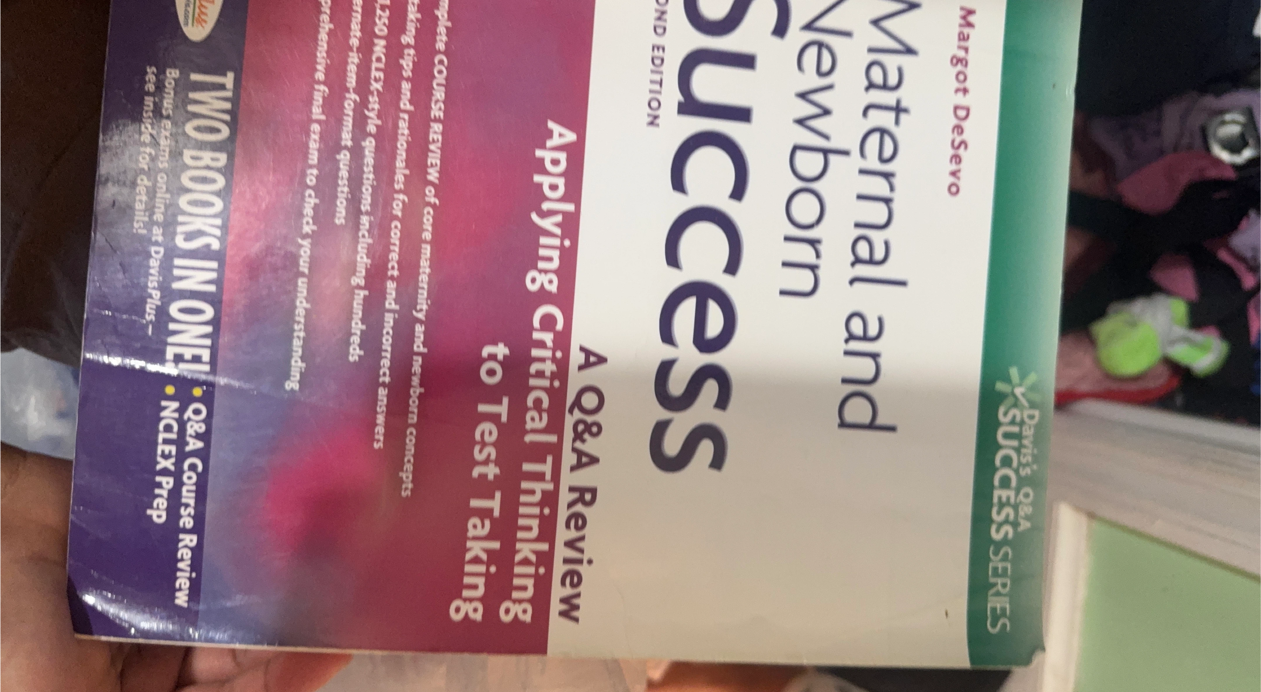 Selling a Maternal and Newborn Success: A Q&A Review book. It's part of the Davis's Q&A Success Series and focuses on applying critical thinking to test taking. This book includes a complete course review of core maternity and newborn concepts, along with 1,250 NCLEX-style questions. It also includes bonus exams online at DavisPlus and is a great resource for NCLEX prep
