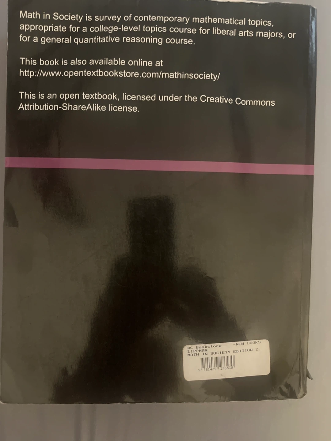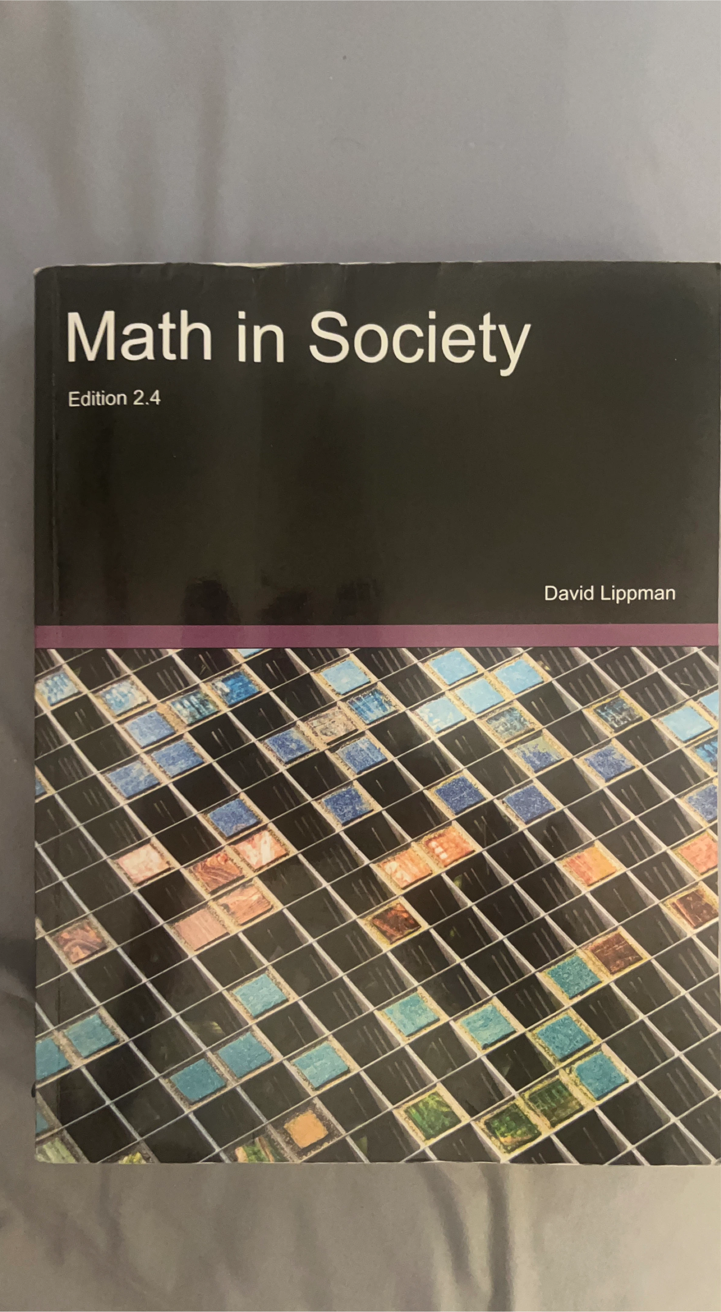 60Selling a copy of Math in Society, Edition 2.4 by David Lippman. It's a survey of contemporary mathematical topics, appropriate for a college-level topics course for liberal arts majors, or for a general quantitative reasoning course. This book is also available online.
