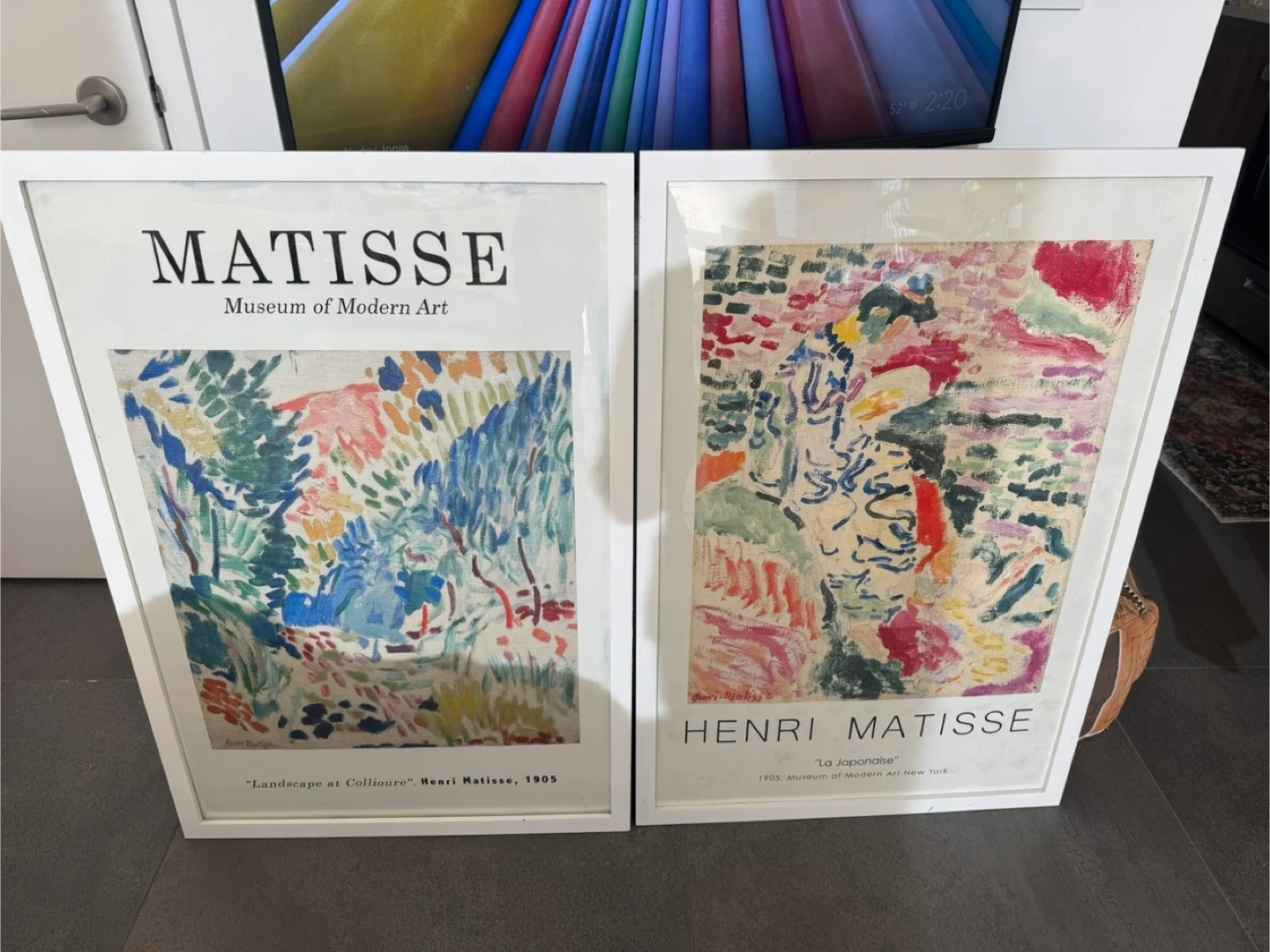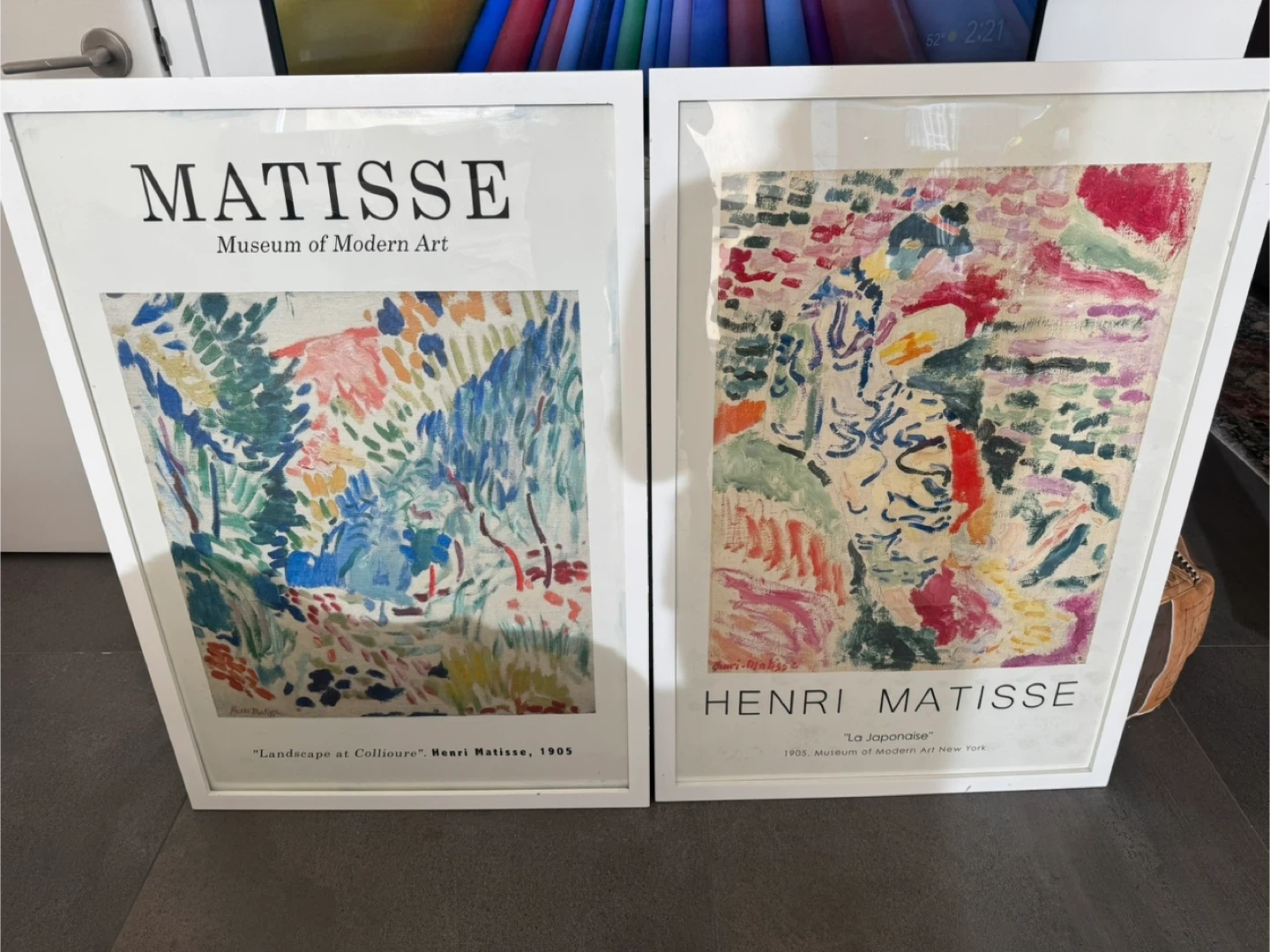 10**One Glass needs to be cleaned or changed. Selling two framed prints featuring the works of Henri Matisse. One is "Landscape at Collioure", Henri Matisse, 1905, and the other is "La Japonaise", 1905, Museum of Modern Art, New York. They're in great condition and ready to add a touch of art to your home.