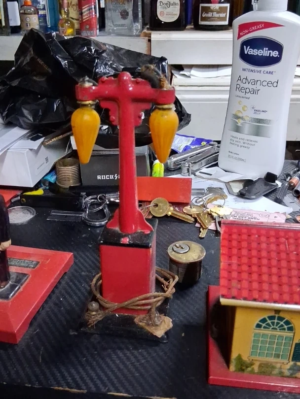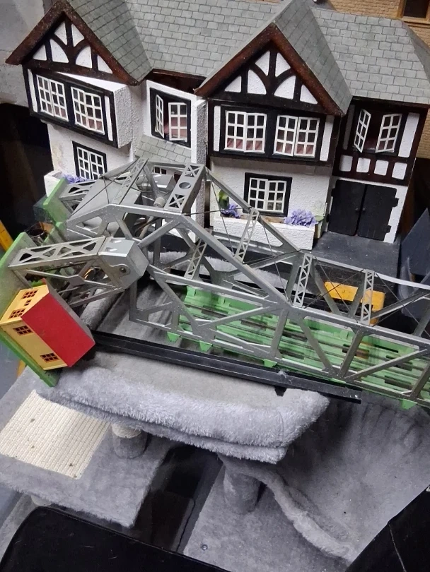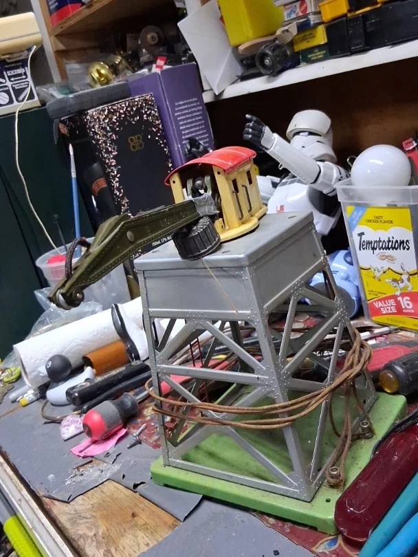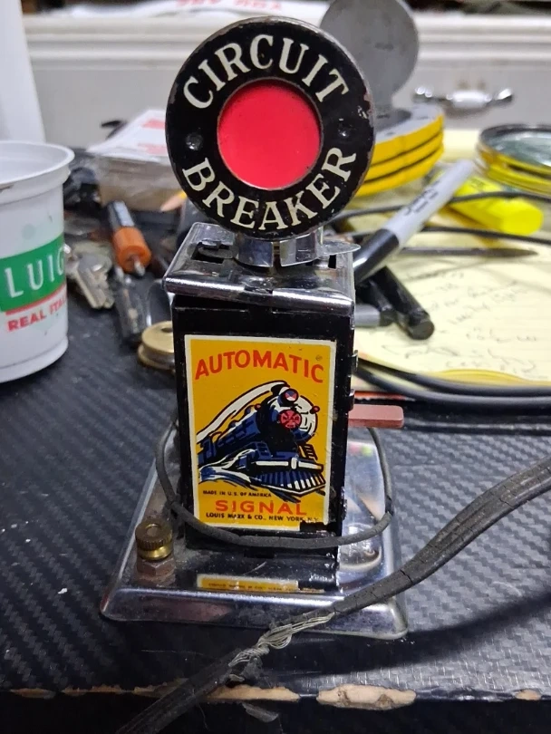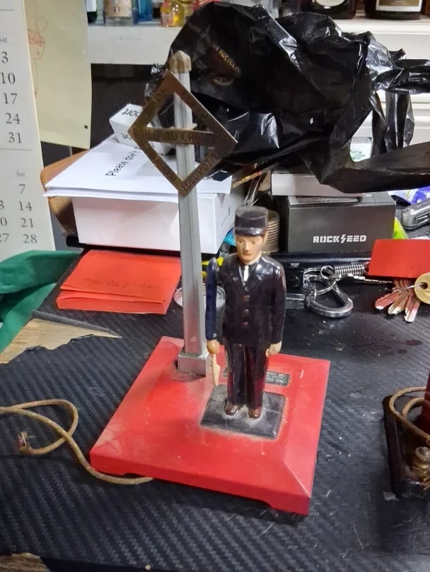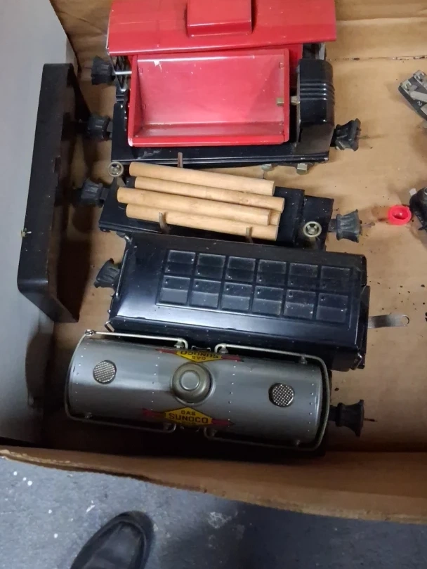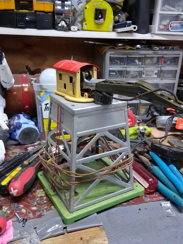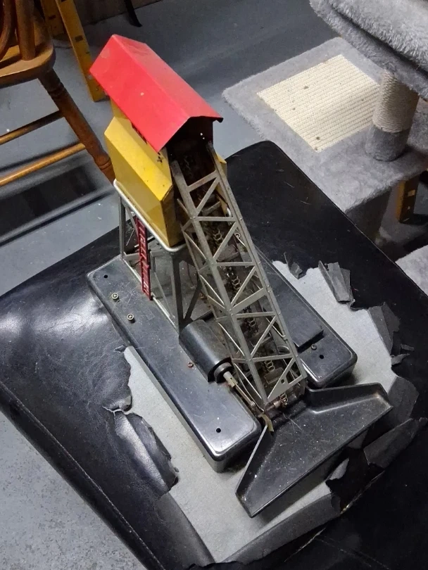 This vintage Lionel train cars ,crane,bridge,singnal lights,Automatic Circuit Breaker signal and other pieces is a cool piece for any train enthusiast. It's designed to look like a classic railway signal with a conductor figure. It's a great display item for a model train layout! Please look at pics