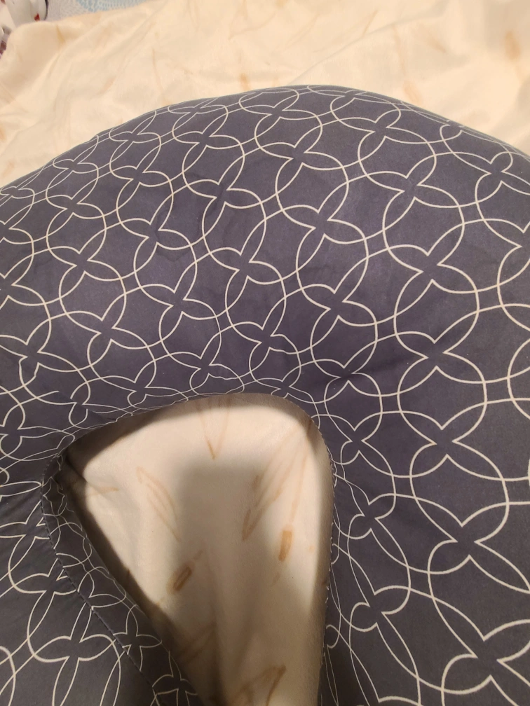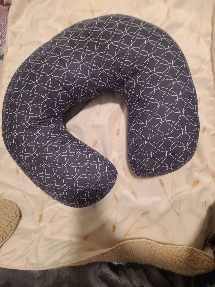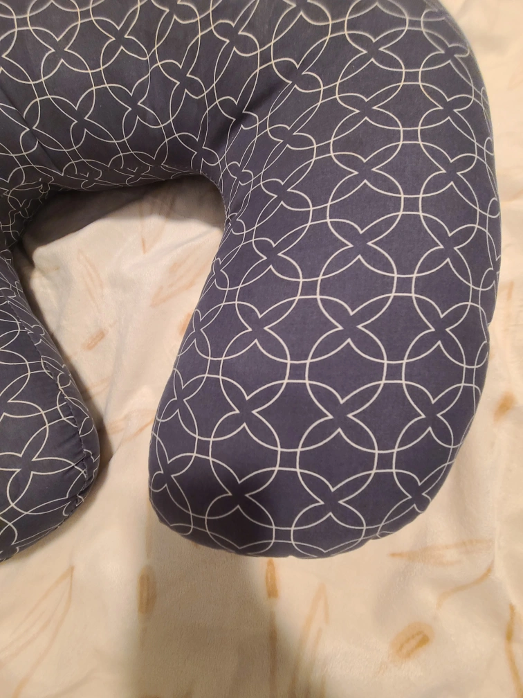 Used U-shaped pregnancy pillow. Gray and white color. Great for pregnancy or just relaxing.for baby feeding too