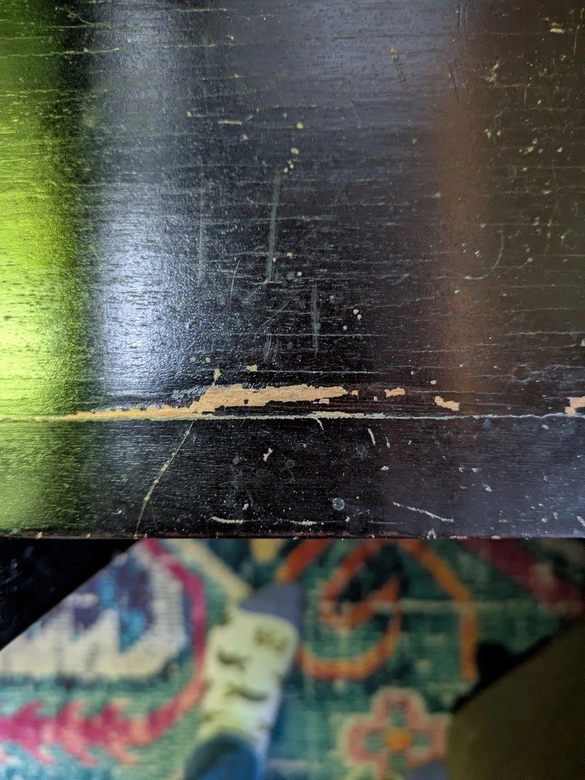 Scratches, nicks, worn paint/stain from normal wear over the past few years (see photo for examples).
