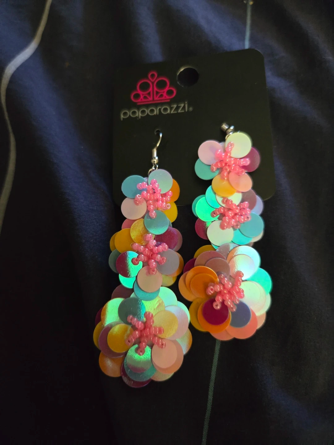 These fun dangle earrings from Paparazzi feature colourful sequin flowers with pink beaded centres. They have a playful, eye-catching design. Perfect for adding a pop of colour to any outfit!