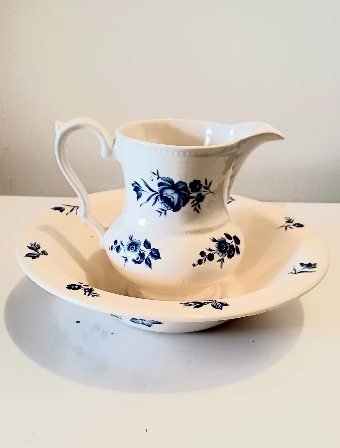Vintage, Mid Century Lord Nelson Pottery pitcher and wash basin set made in Staffordshire, England. This specific set is made of white porcelain and features a vibrant blue rose and botanical design.