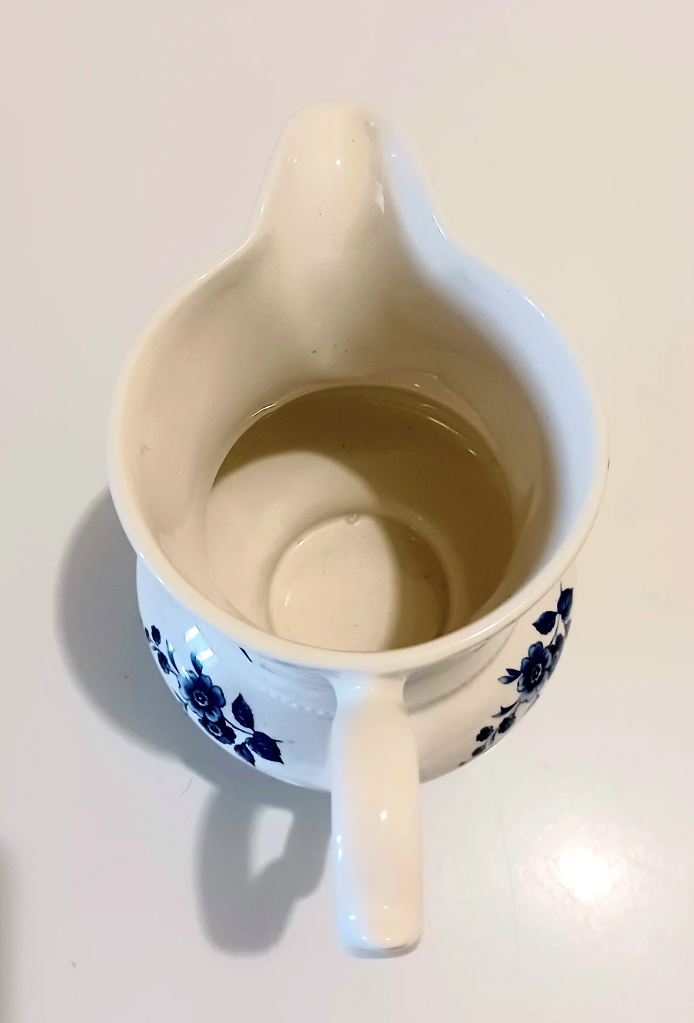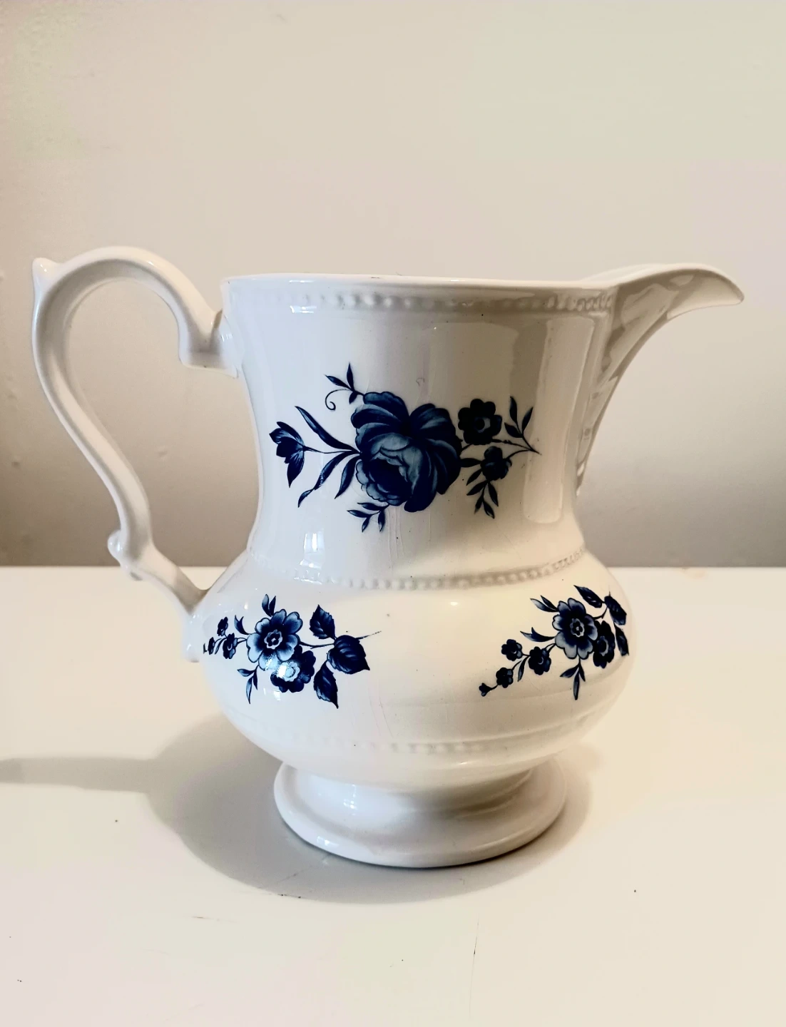Material: White porcelain or ironstone with cobalt blue floral design