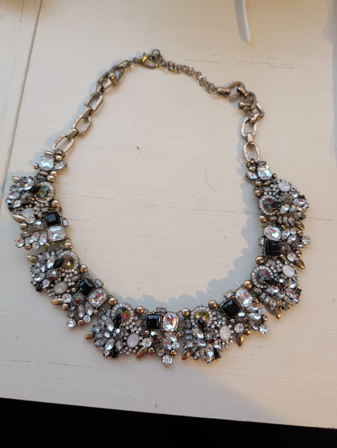 This statement necklace features a mix of clear and black faceted stones, set in an antiqued gold-tone metal. It has a chunky link chain with a clasp closure.