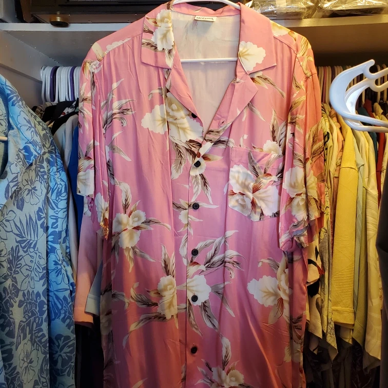 18Selling a MCF&ARLANE Hawaiian shirt with a beautiful pink floral design! It's in great condition and perfect for adding a pop of color to your wardrobe