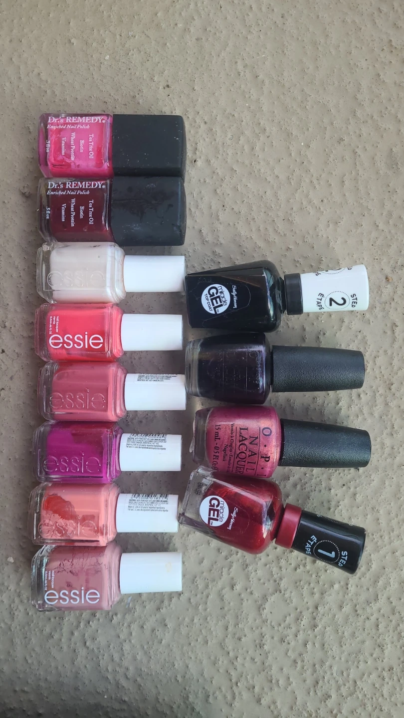 A collection of nail polishes including Essie, OPI, Dr's Remedy, and Sally Hansen Miracle Gel. Includes various shades and finishes. Most bottles are 0.5 fl oz. This lot is great for anyone looking to expand their nail polish collection!