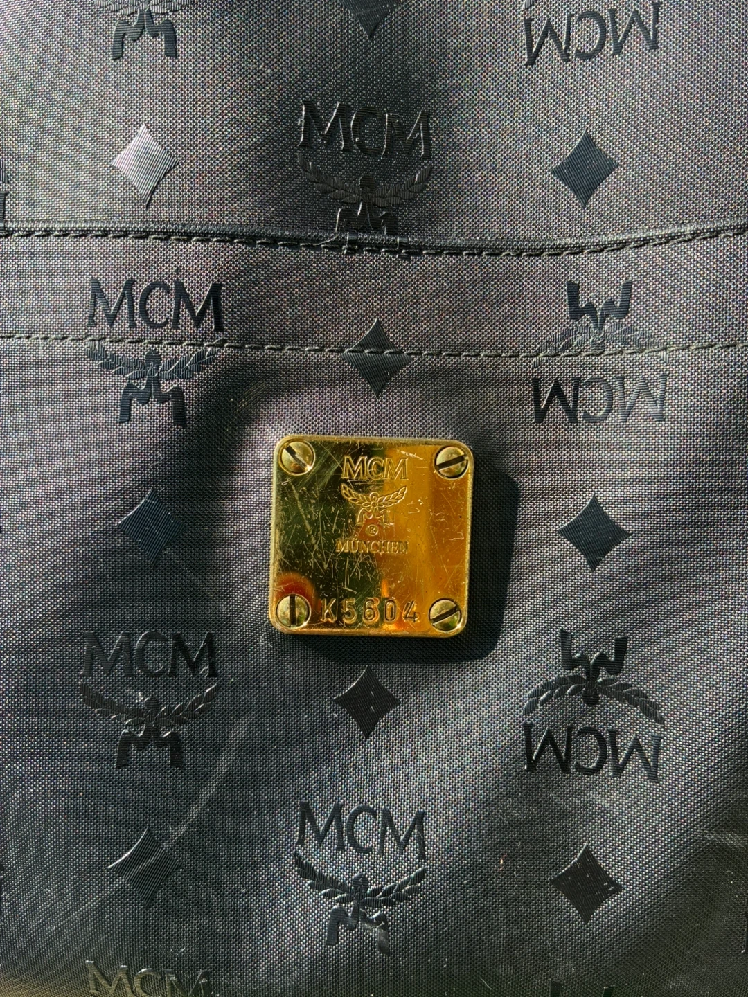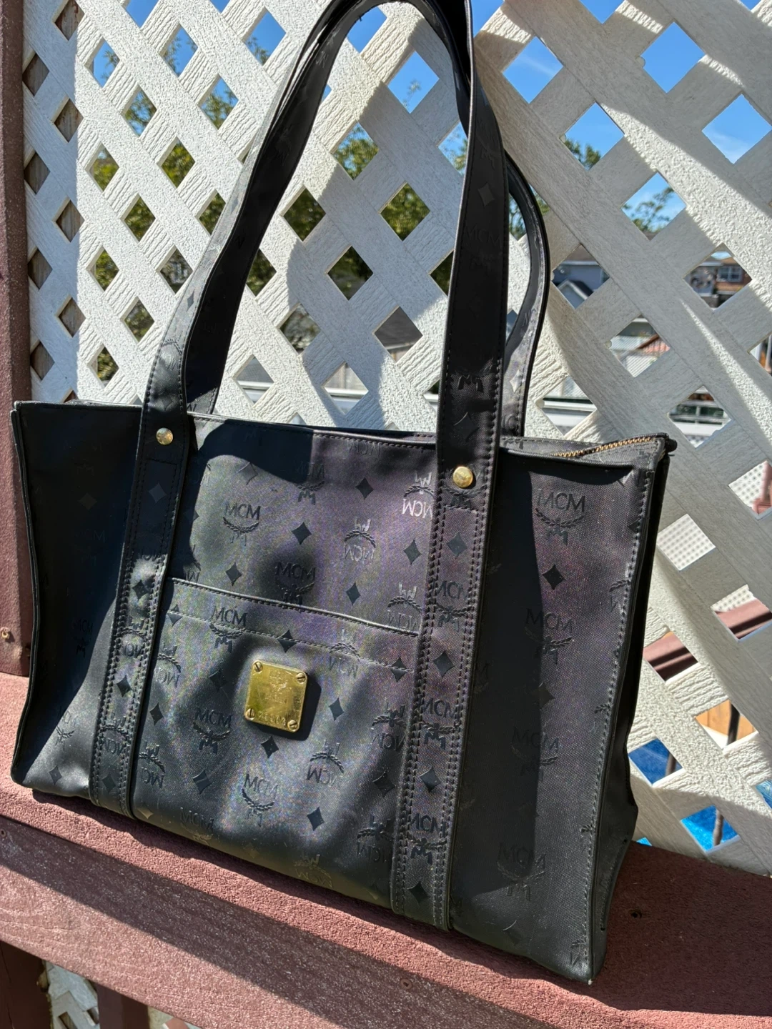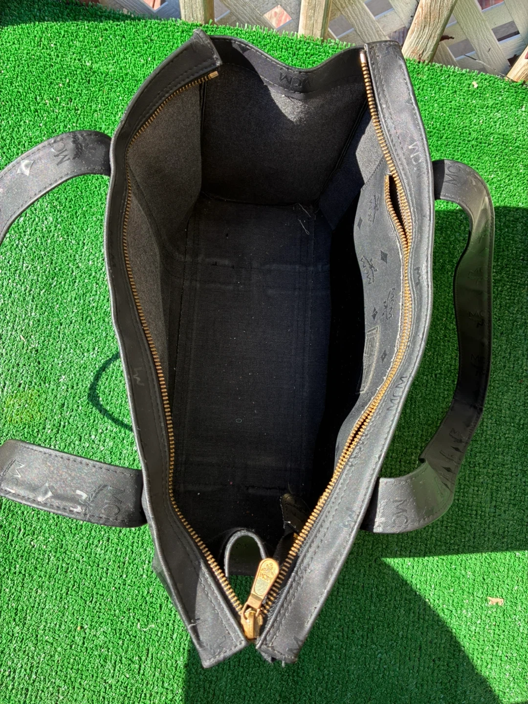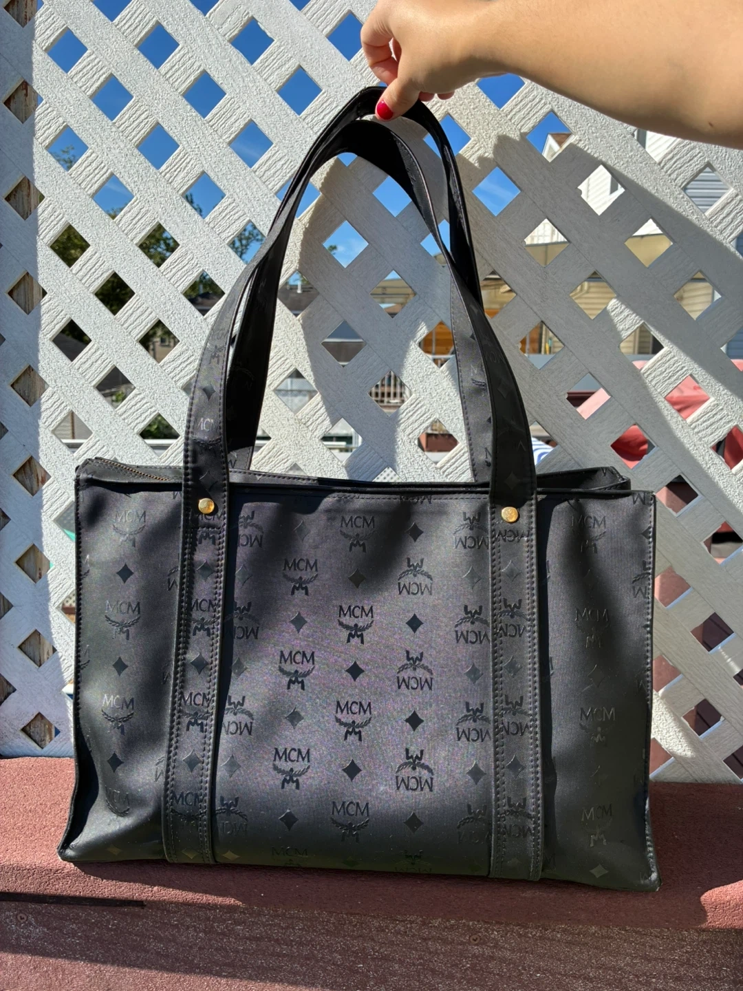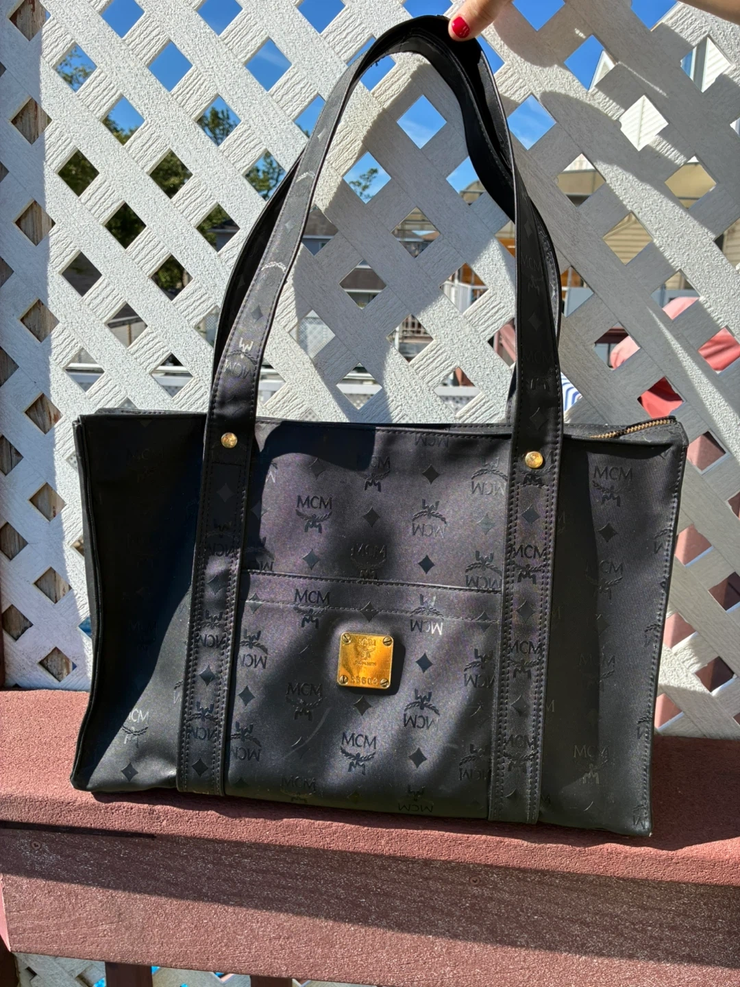 stylish MCM tote bag in black. It features the MCM gold logo pattern throughout the bag. Great for everyday use! Open to offers