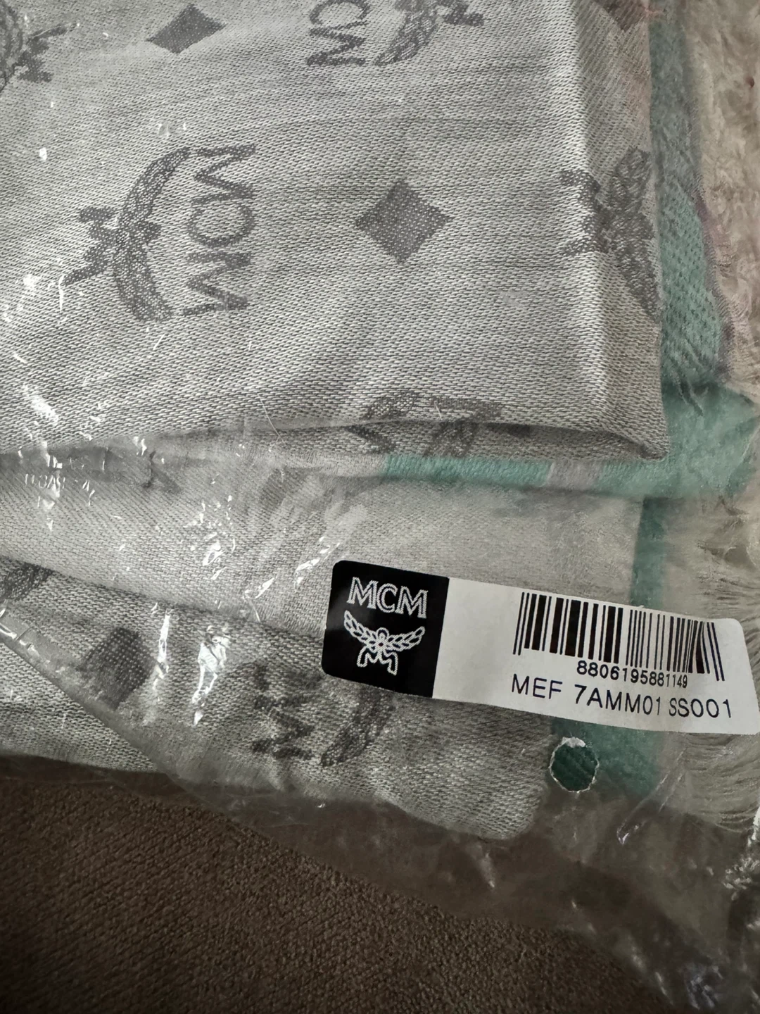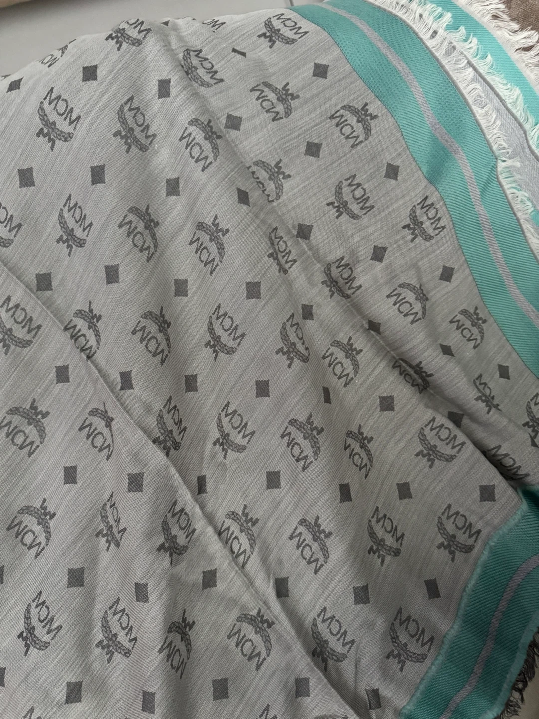 Selling a beautiful MCM scarf made in Italy. It's a blend of 46% wool, 42% viscose, and 12% silk, giving it a luxurious feel. The scarf features the classic MCM logo pattern in gray with a mint green border. It's dry clean only to keep it in great condition!