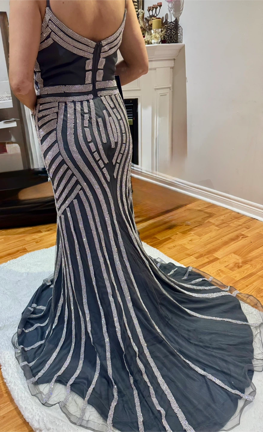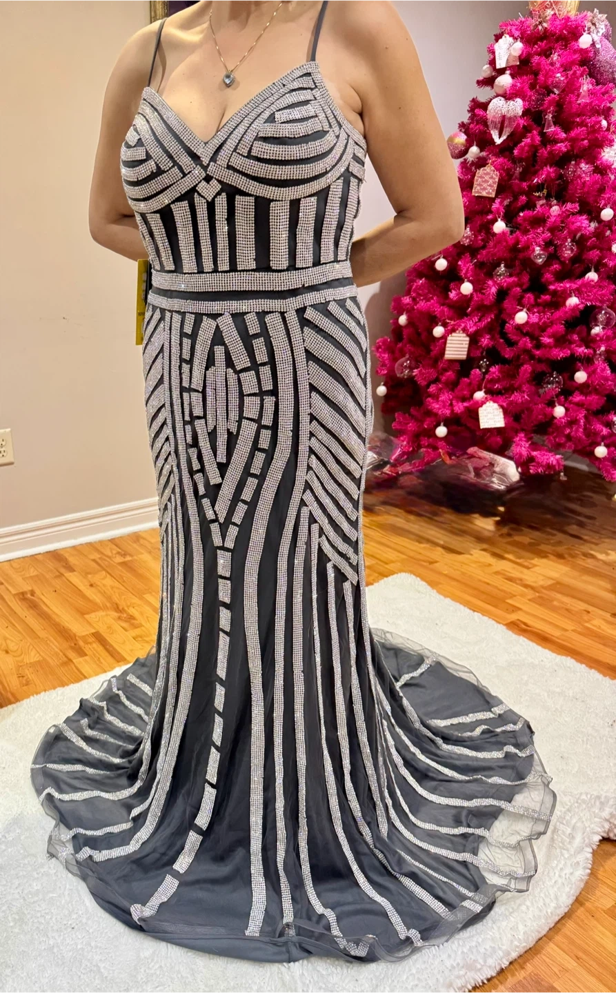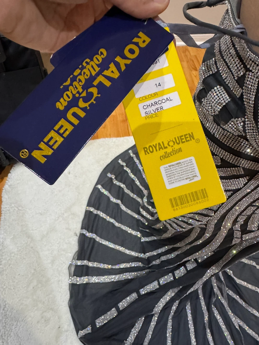 Selling a stunning Royal Queen Collection gown in size 14. The dress features a beautiful charcoal and silver colour scheme. It's perfect for a special occasion and is sure to turn heads!