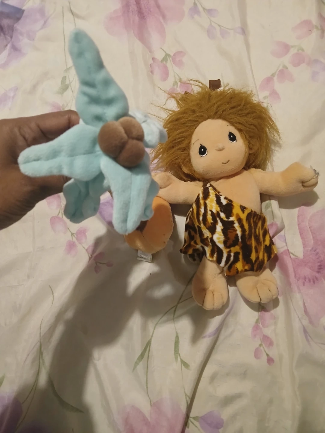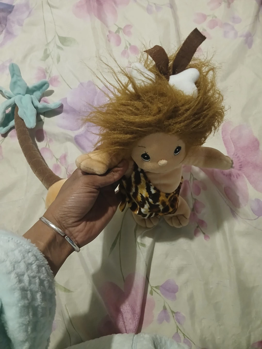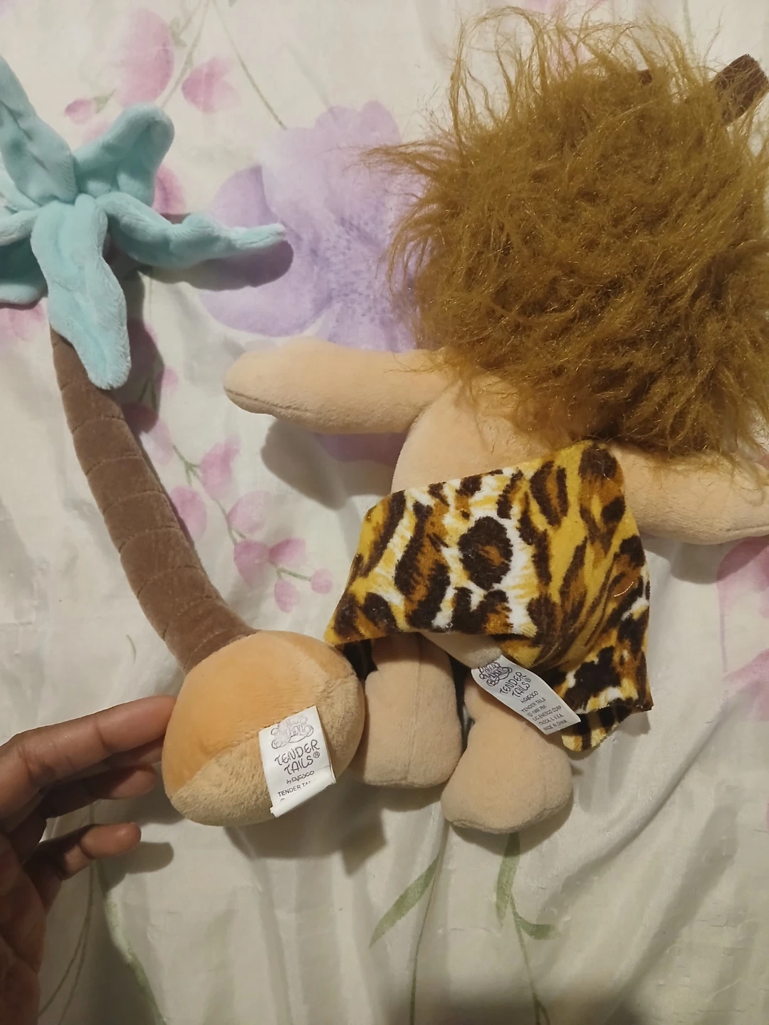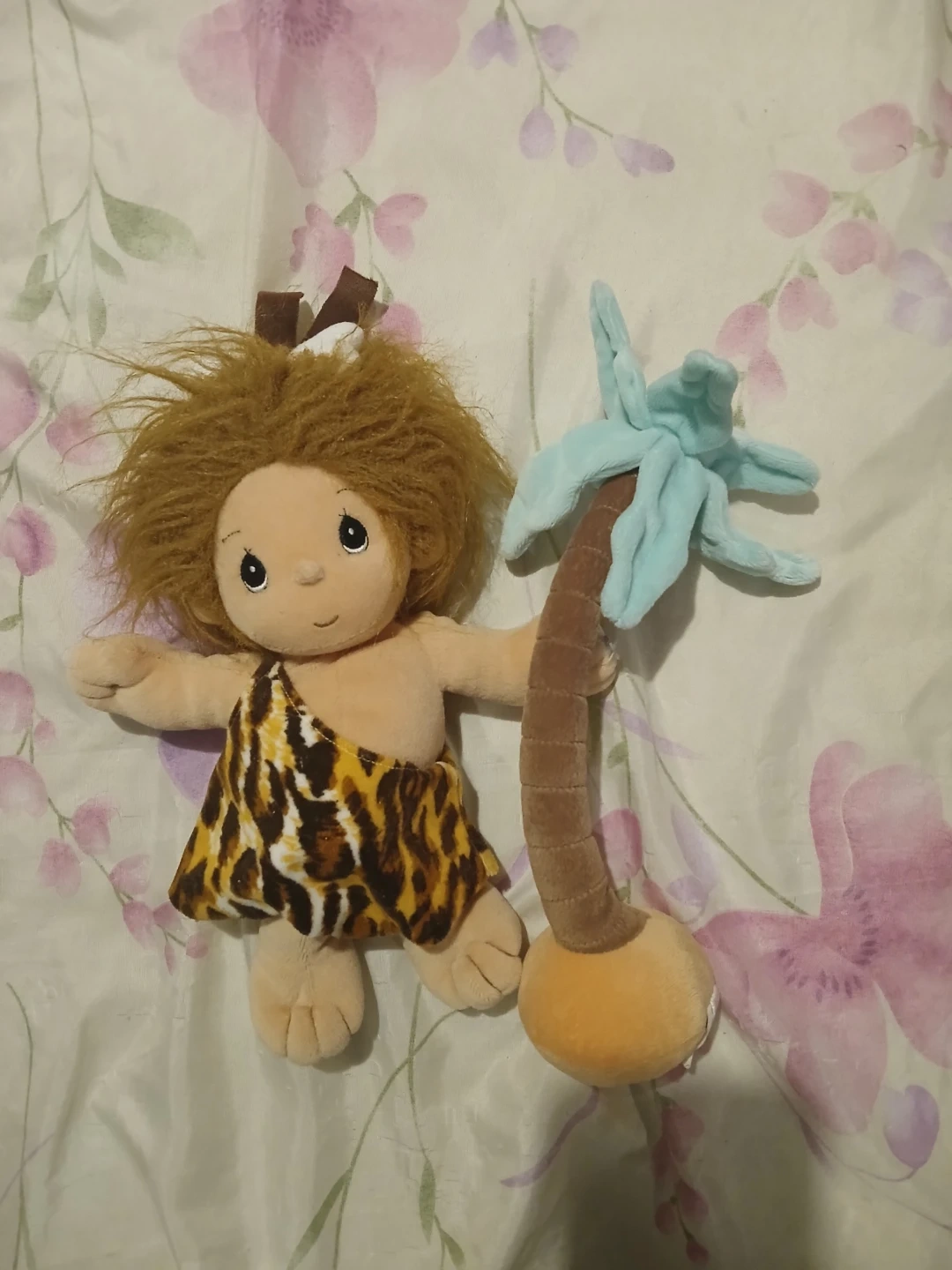This is a cute Tender Tails caveman plush toy. It's soft and comes with a little palm tree accessory. Its distinctive features include a leopard print loincloth and wild brown hair!