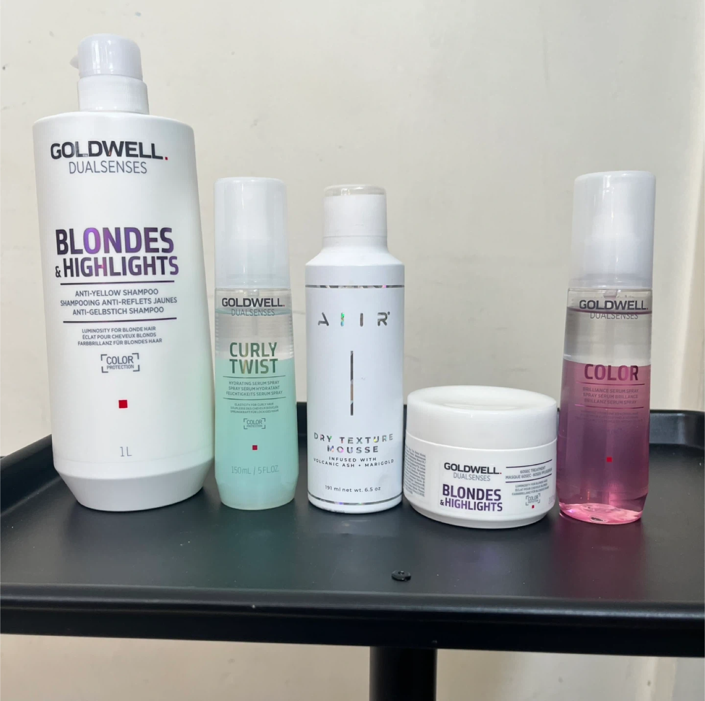 Goldwell, Productos profesionales de cabello nuevos. Los estoy vendiendo porque ya no estoy haciendo trabajos de cabello. Shampoo, mascarilla para rubios,serum para hidratar y proteger el cabello deja un rico aroma , y un mousse de Air. Todos están nuevos y no se han usado.