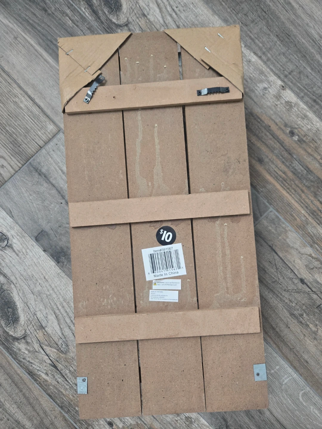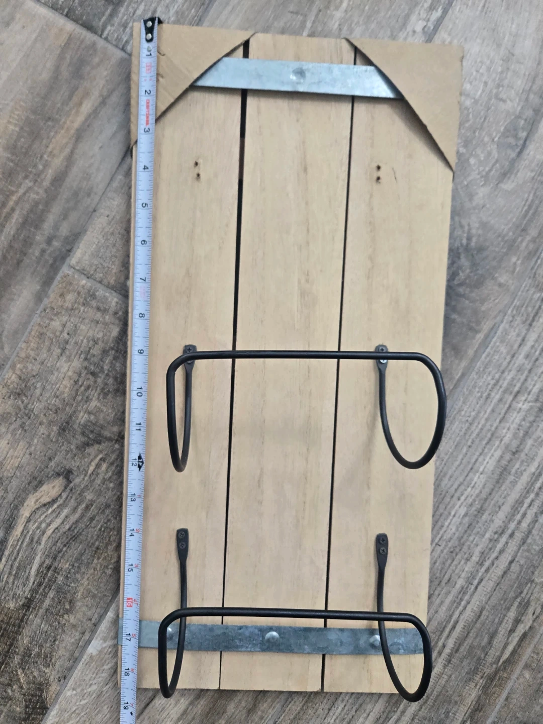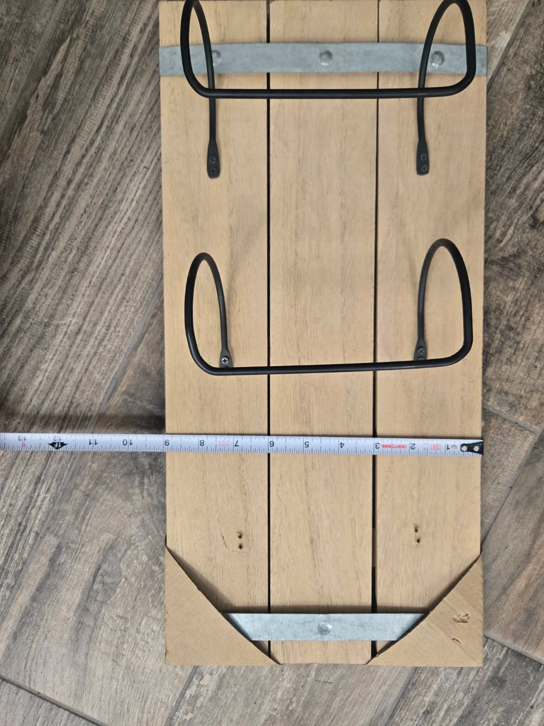 This wooden wine rack is perfect for displaying your favorite bottles! It's in great condition and ready to hang. It measures approximately 18 inches in height and 11 inches in width. Originally bought for $10!