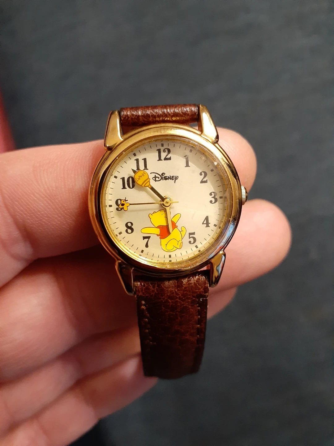 Gold-tone Disney watch with a cream-colored face. Features Winnie the Pooh graphic and a brown leather band. Quartz movement.