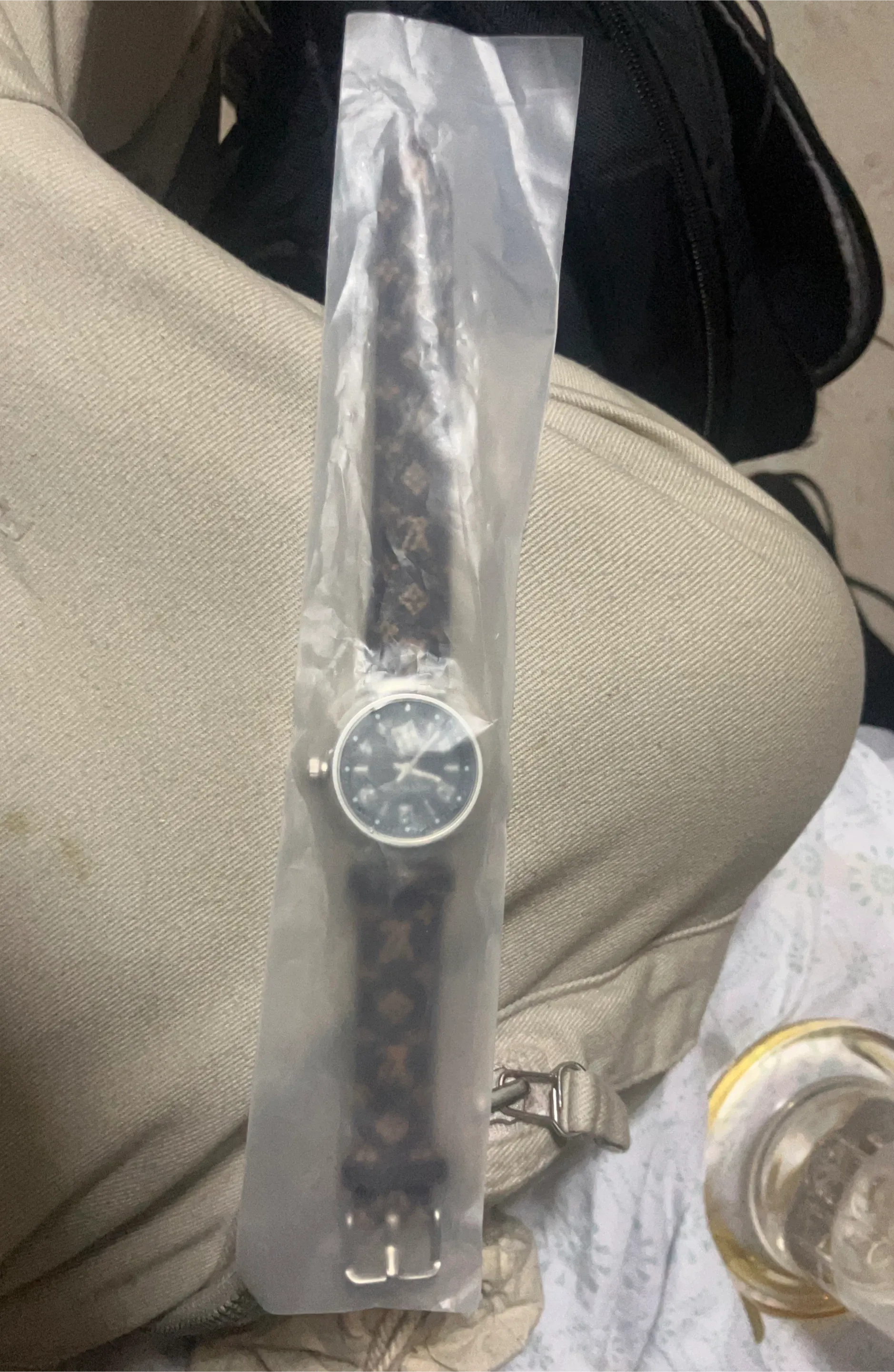 This watch features a round dial with a dark face and silver-tone hands. It comes with a stylish band showcasing a repeating monogram pattern. The band is adjustable with a buckle closure.