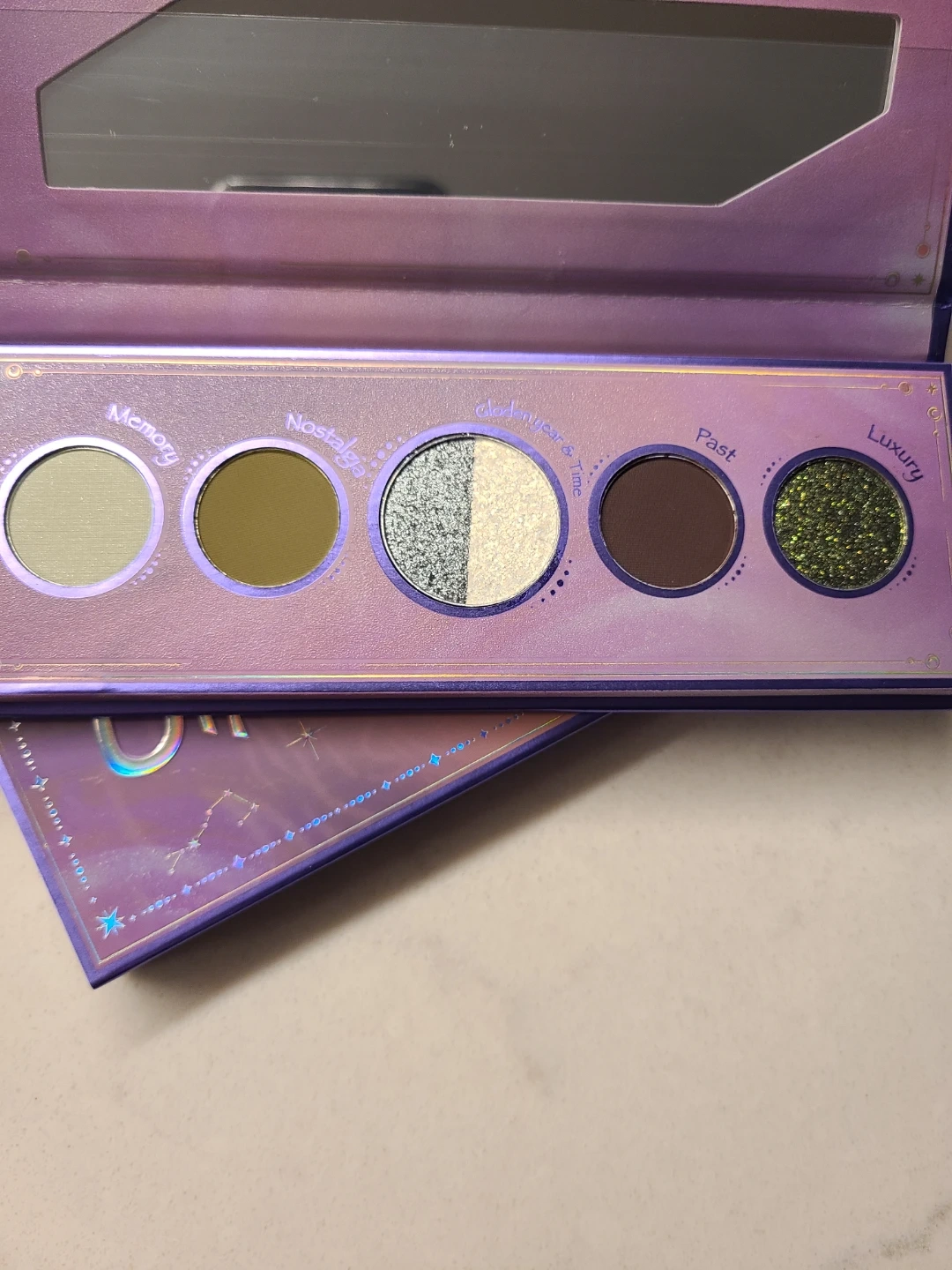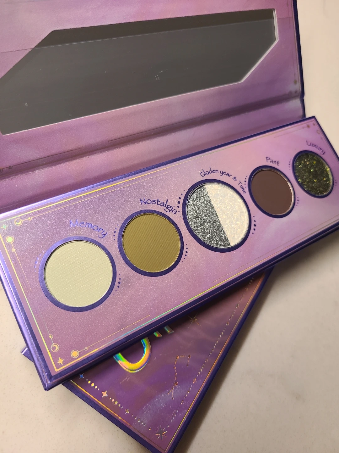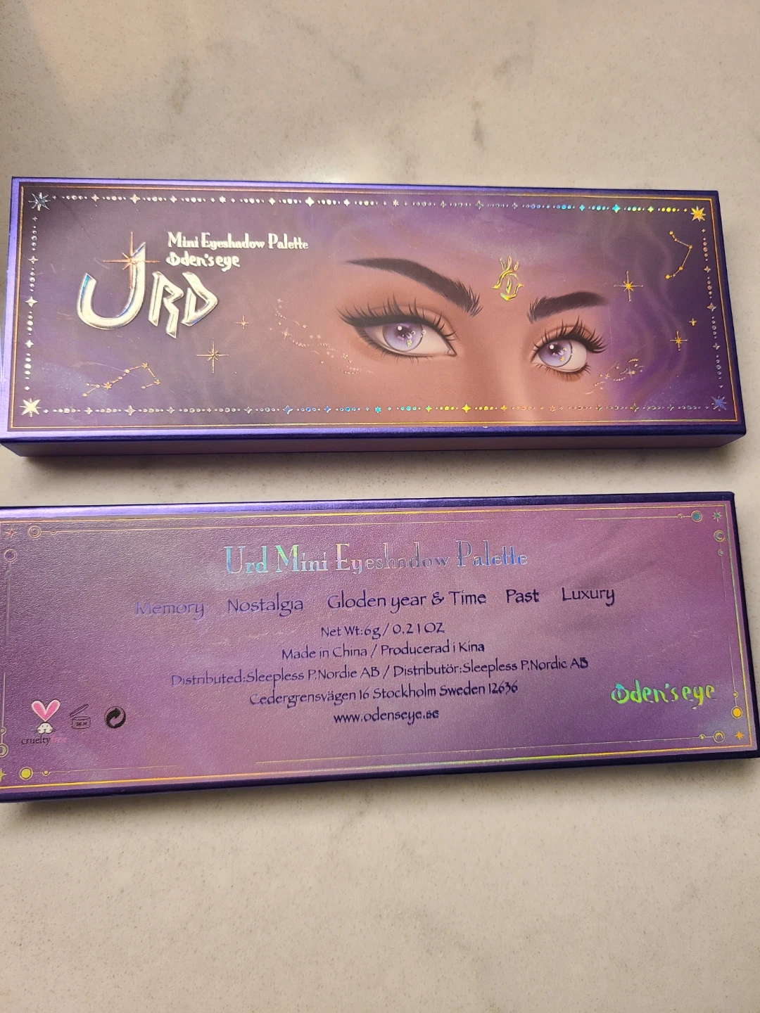 Odens Eye Urd Mini Eyeshadow Palette features five shades: Memory, Nostalgia, Gloden year & Time, Past, and Luxury. It's a mini palette with a net weight of 6g or 0.21 oz. The palette includes a mirror.