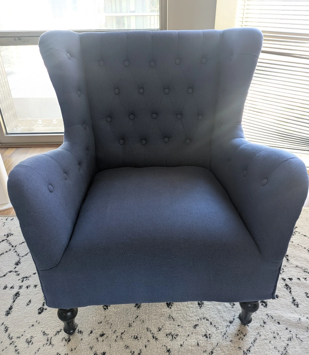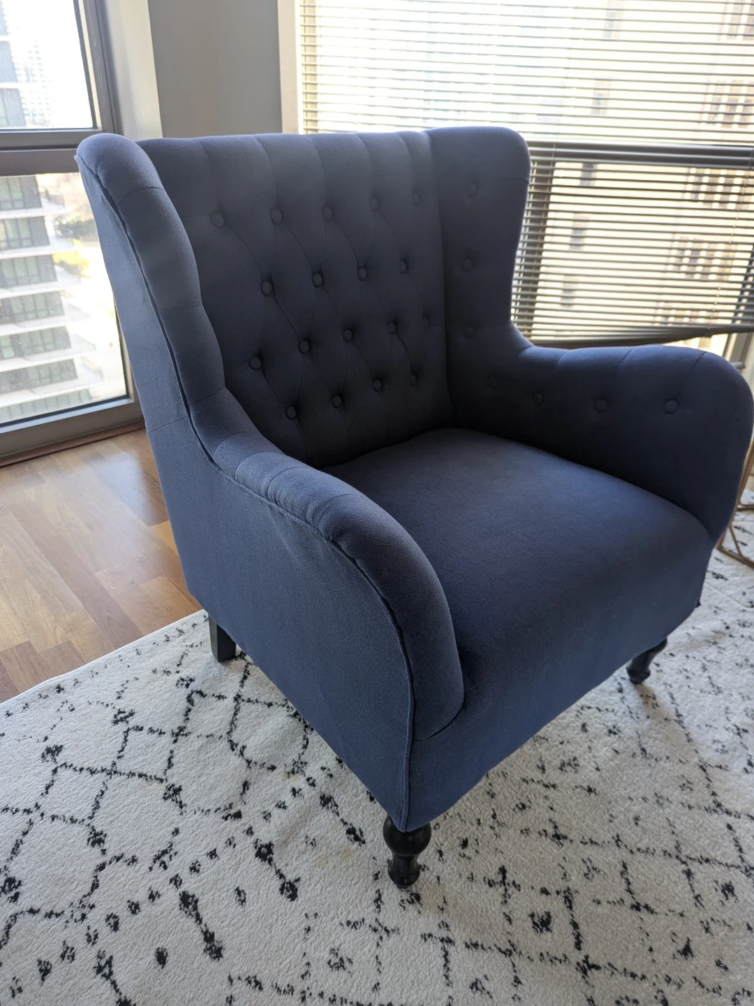 Navy blue accent chair with button tufting and wingback design. Approx. 38" tall x 30" wide x 28" depth. Great condition - only selling because I'm moving to another state and can't take with me.