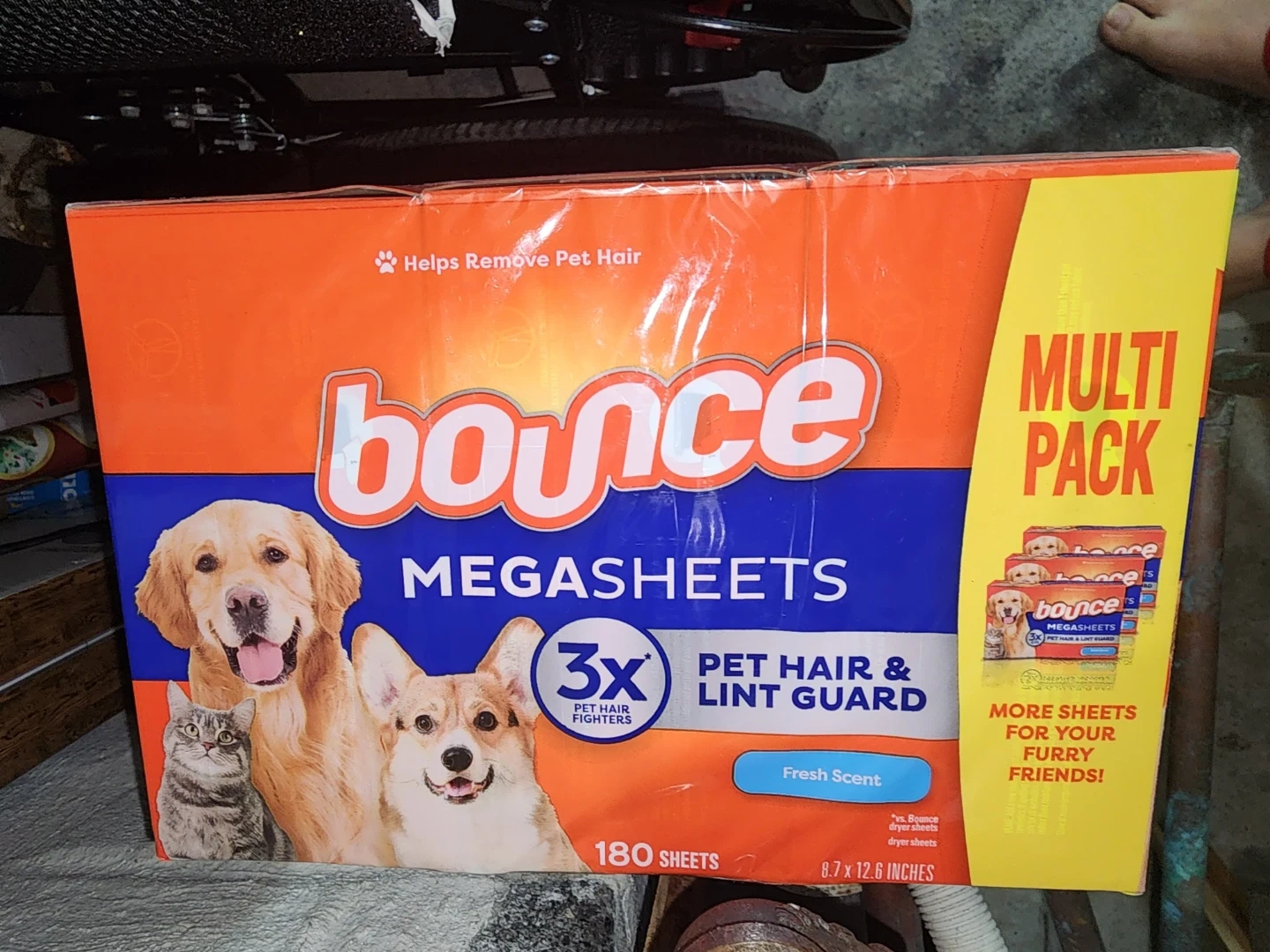 Bounce Megashees dryer sheets are designed to help remove pet hair and lint. This multipack contains 180 Fresh Scent sheets. The dimensions are 8.7 x 12.6 inches.
