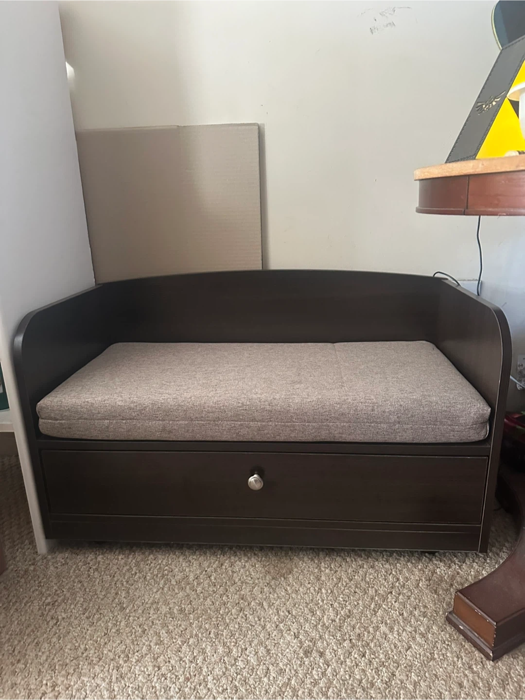 65New, never used dog bed with built-in storage drawer (interior ~28" × 11") to stow toys, treats, leashes, and other pet accessories. My dog is scared of it. Priced to move; originally $200 from Wayfair and has since been retired. Cozy & Clean Design – 3" thick removable foam mattress with a zippered, machine-washable cover. Ideal for Small to Medium Pets – Generous sleeping area (30" W × 14.5" D) accommodates Dogs and Cats up to 50 lb; overall dimensions 31.5" W × 15.75" D × 19.25" H. Size: Medium Color: Brown Animal: Dog Open to offers! Dog bed Pet furniture Storage