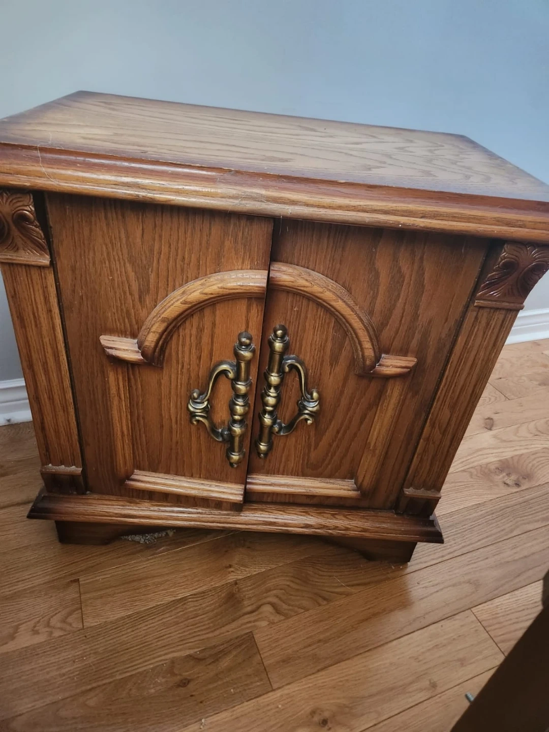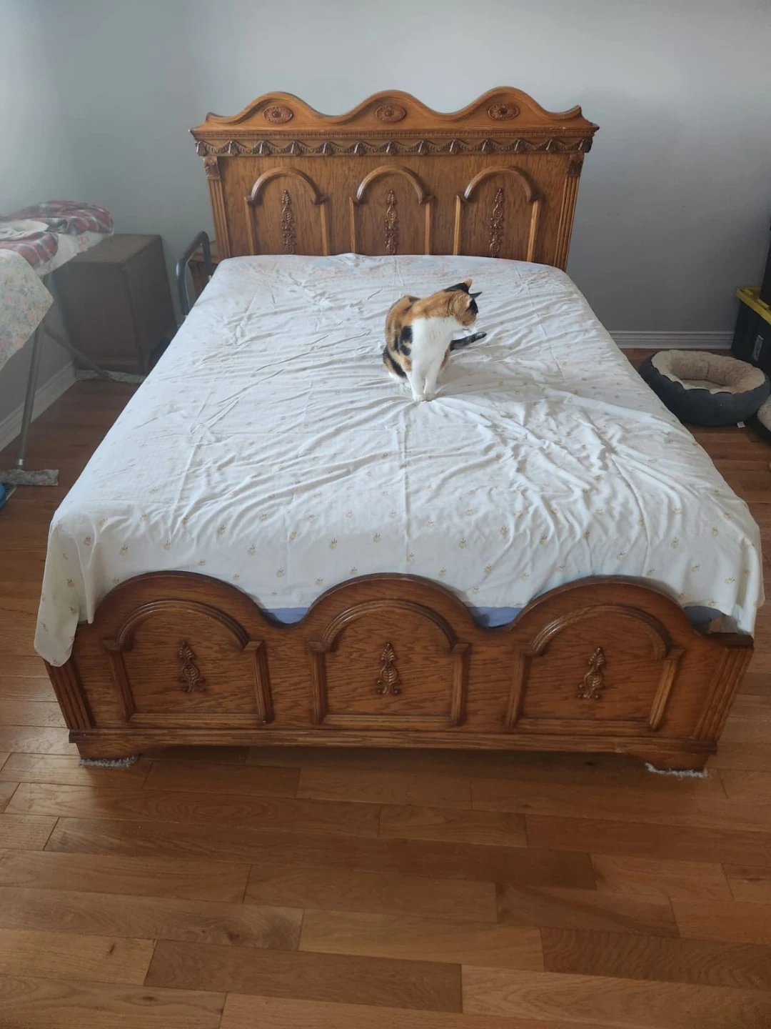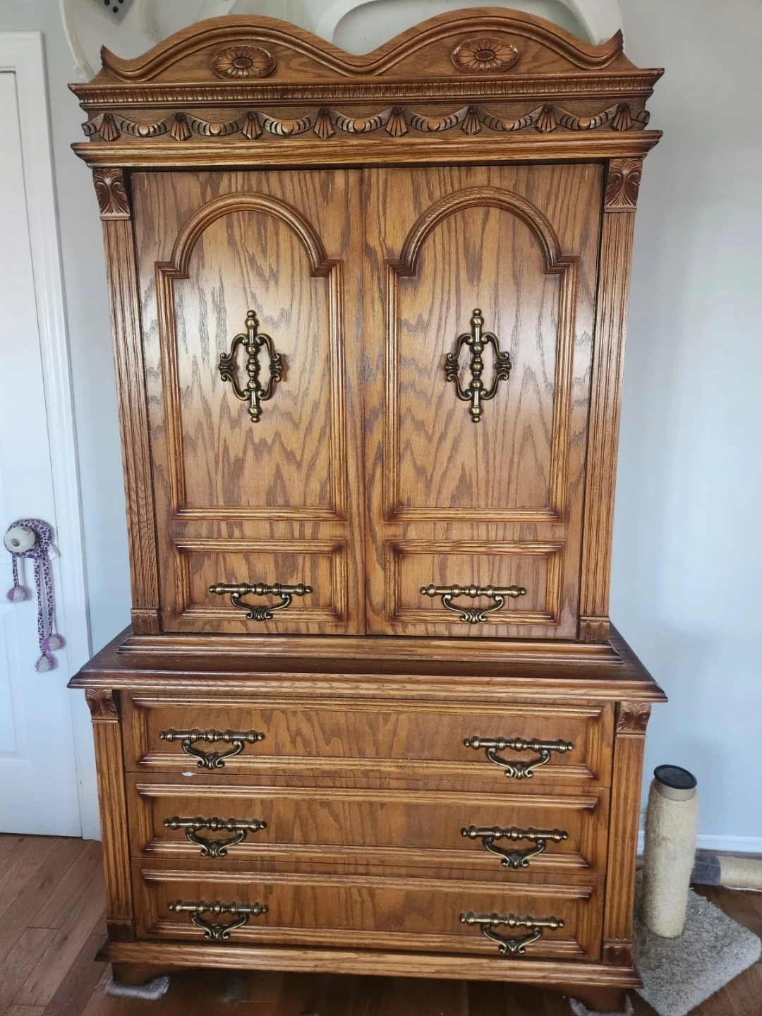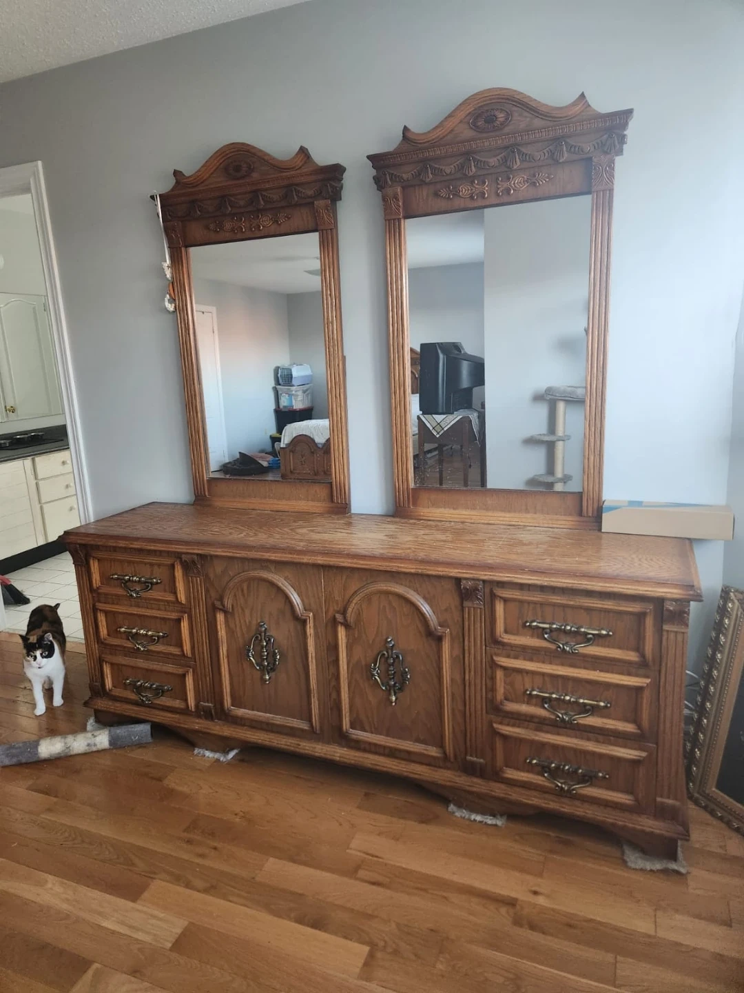 This is a beautiful vintage bedroom set made of solid wood with ornate detailing. Includes a large dresser, two mirrors, a tall armoire, a queen-size bed frame, & 2 matching nightstands. The wood has a rich, warm tone and it's all finished with antique brass hardware. This set would make a stunning centrepiece for any bedroom!
