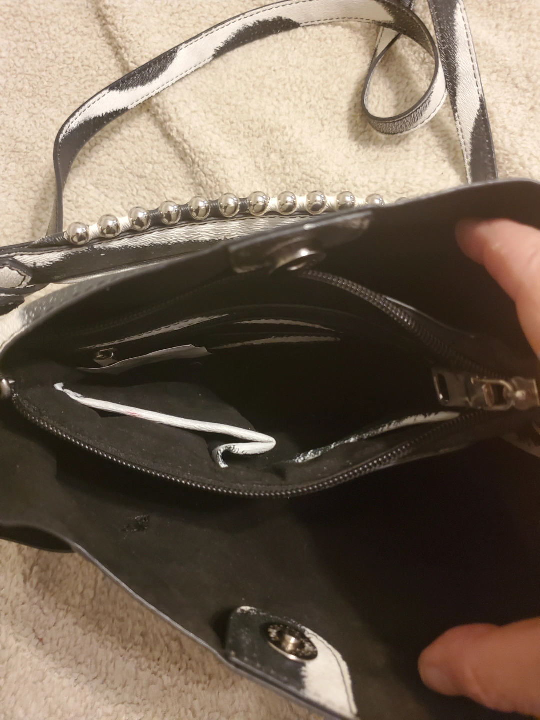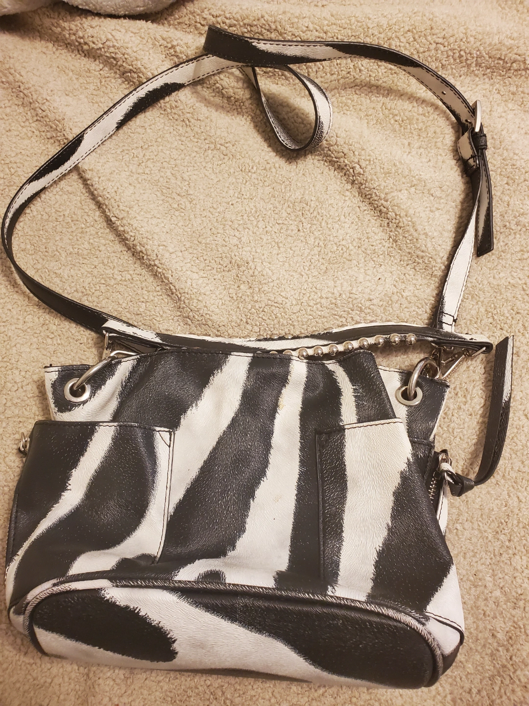 Black and white zebra print crossbody bag. Adjustable strap. Zipper closure. Exterior pockets. Interior zipper pocket. Some wear.