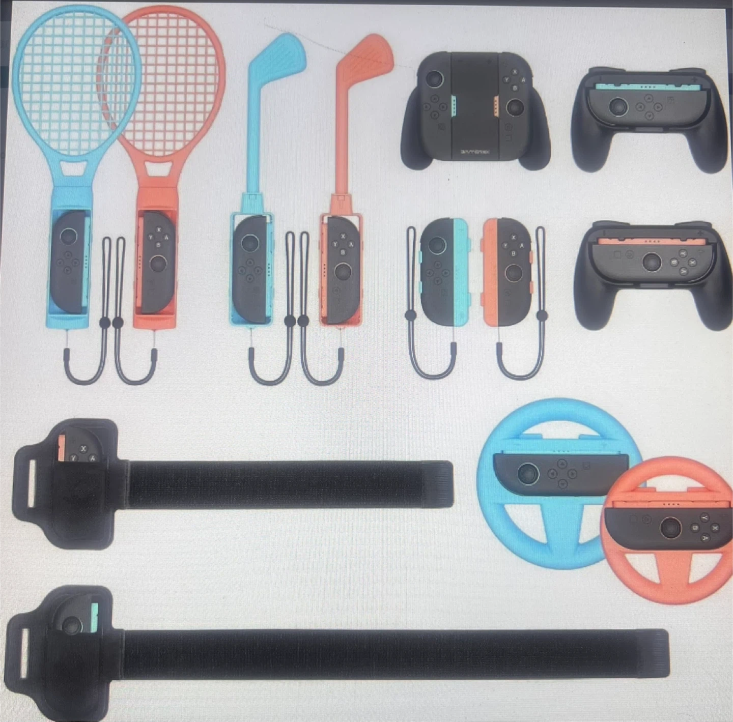 This accessory set includes two tennis rackets, two golf clubs, two steering wheels, and two leg straps. It also comes with two Joy-Con grips and two separate Joy-Con controllers in blue and orange. Everything you need for some active gaming fun!