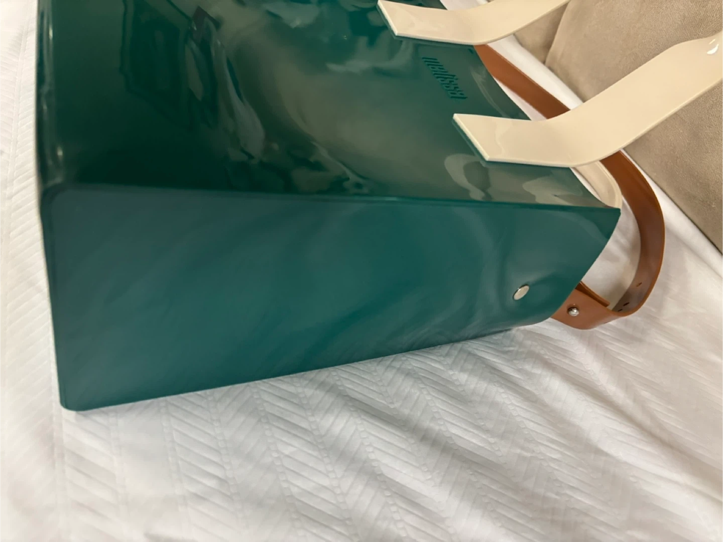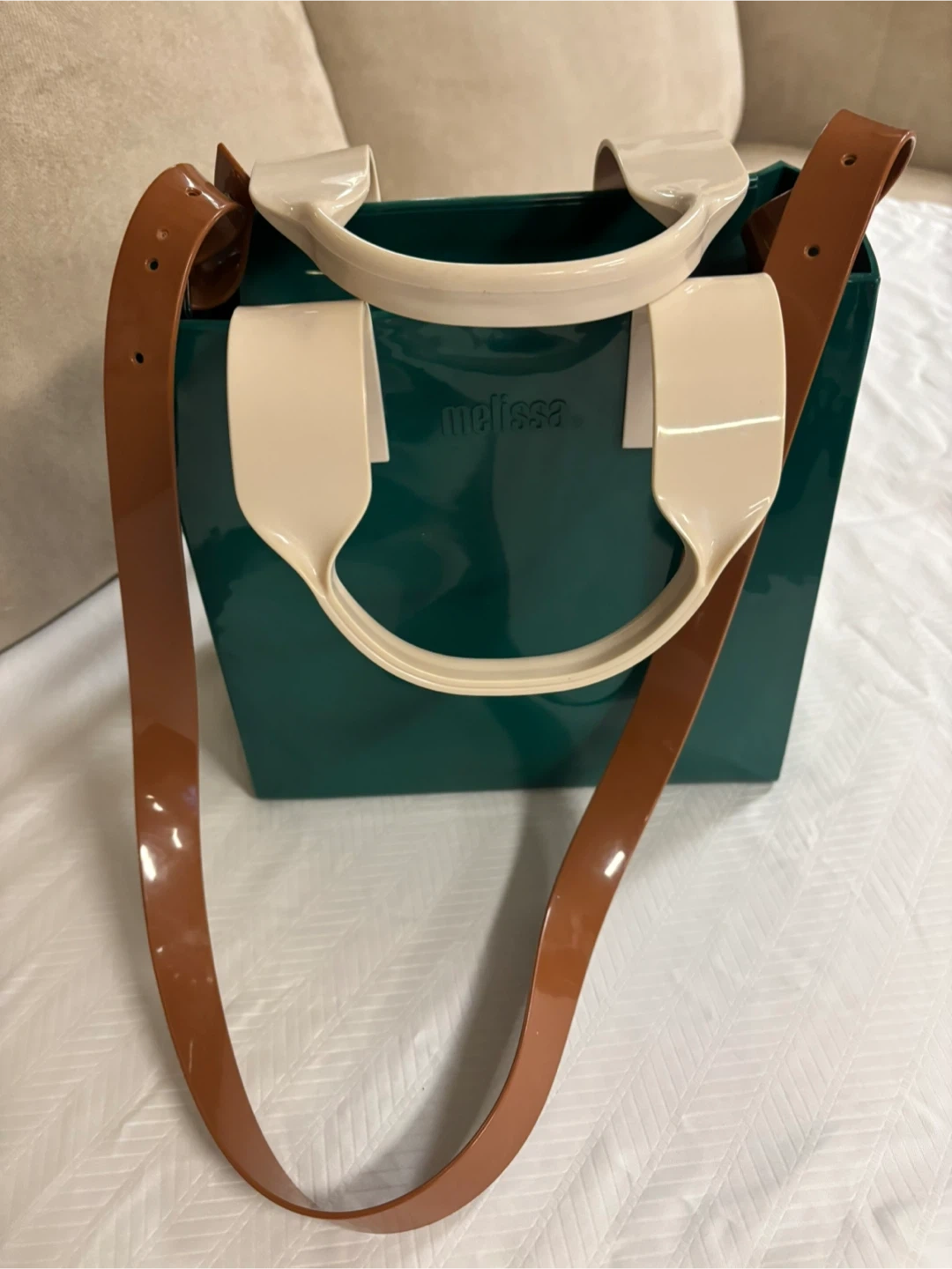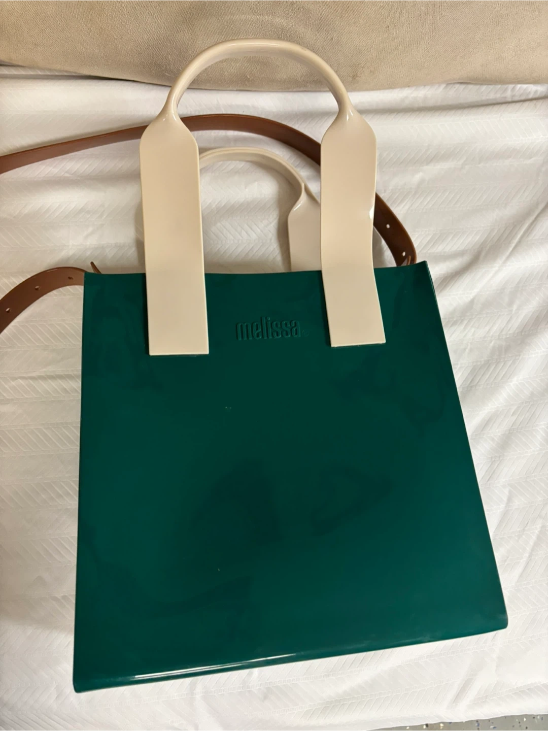 Selling a Melissa tote bag in a beautiful green color. It has cream-colored handles and a brown shoulder strap. It's in great condition and ready for a new home