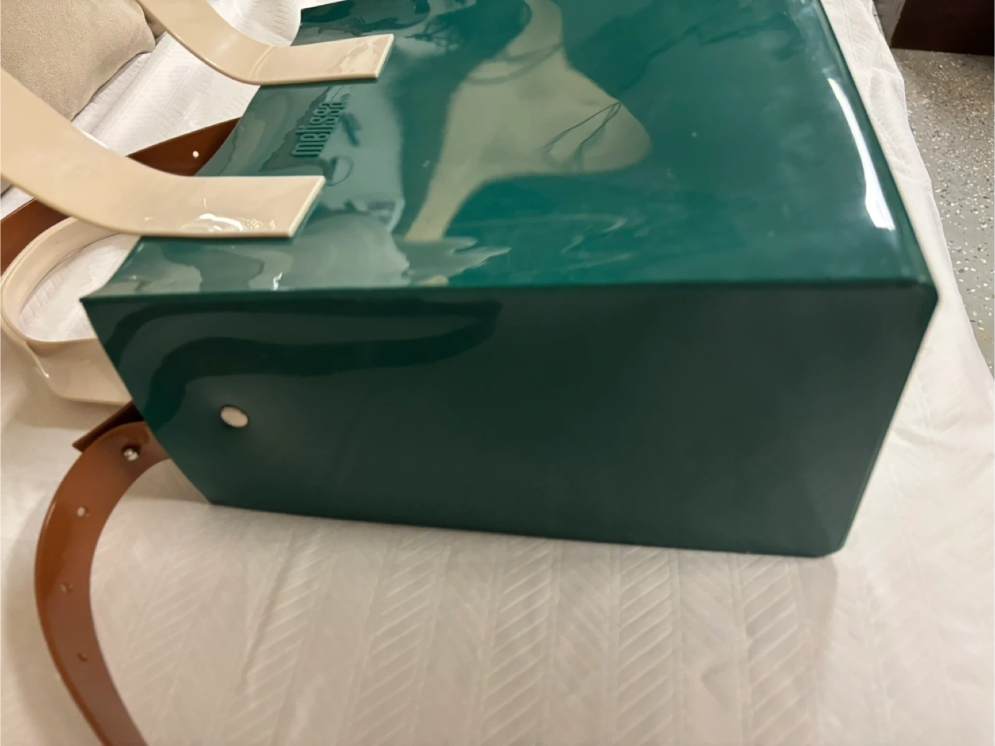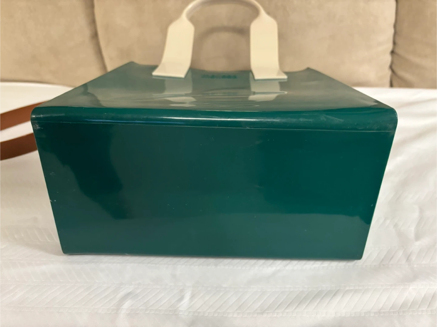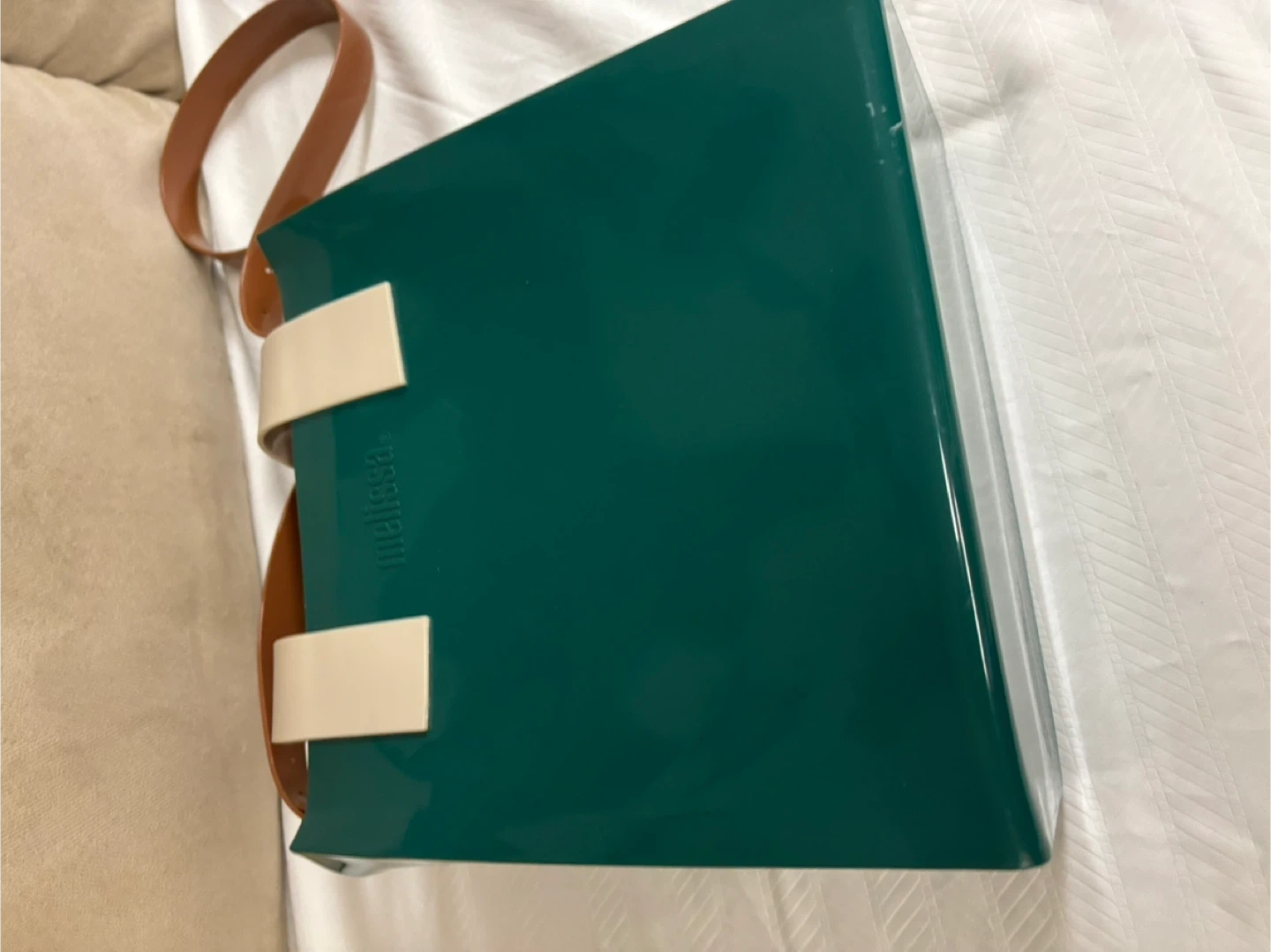 Selling a Melissa tote bag in a beautiful green color. It has cream-colored handles and a brown shoulder strap. It's in great condition and ready for a new home
