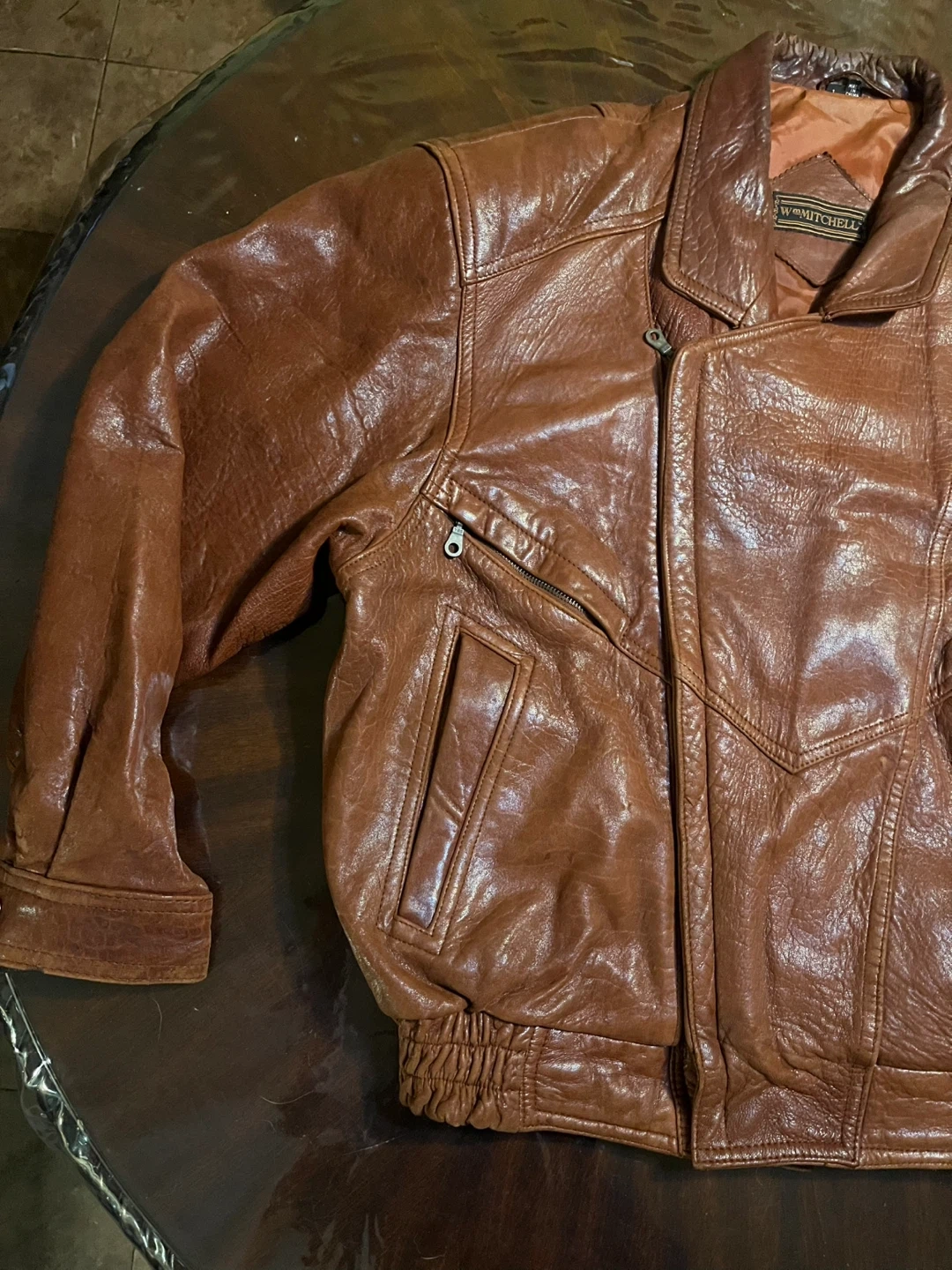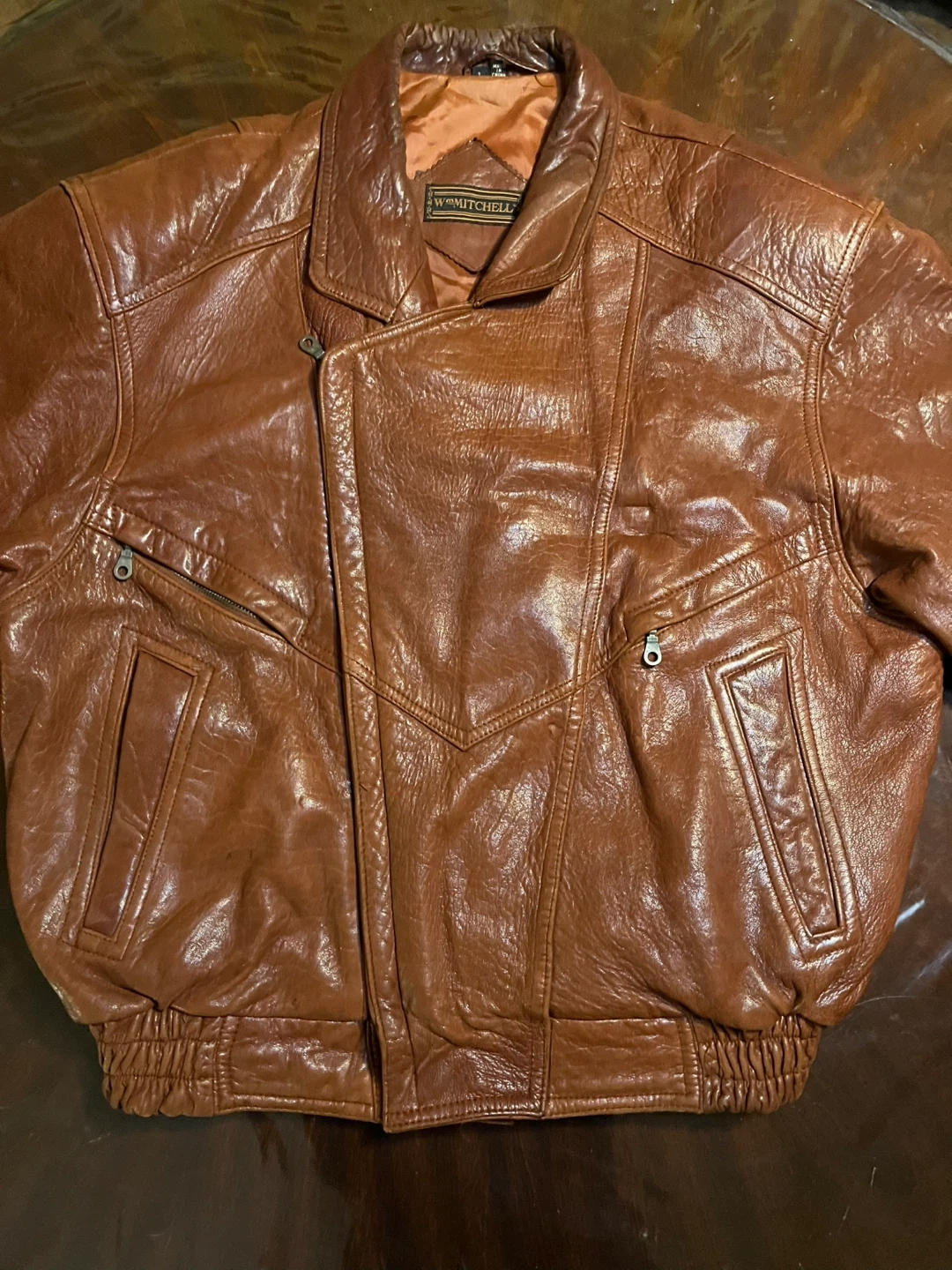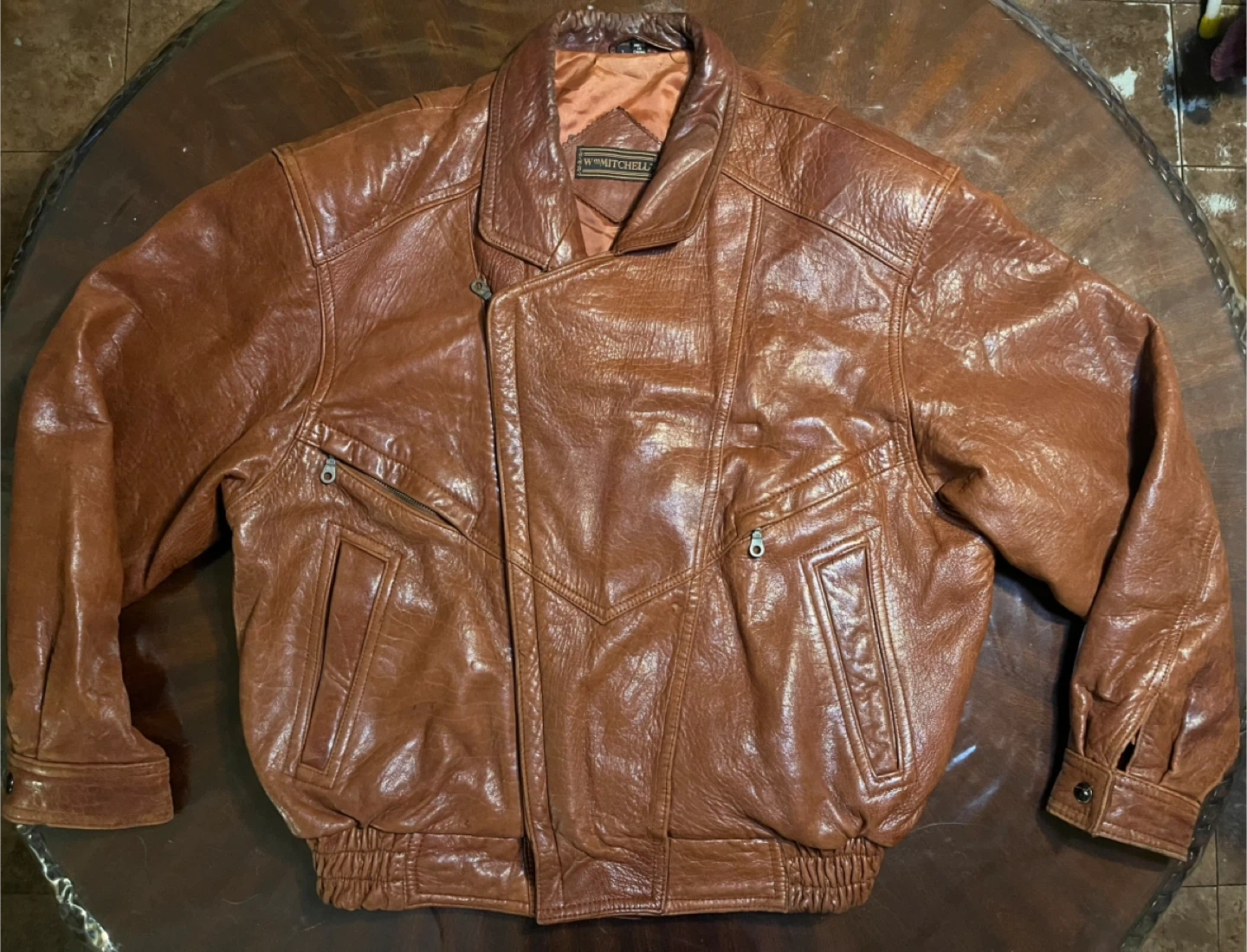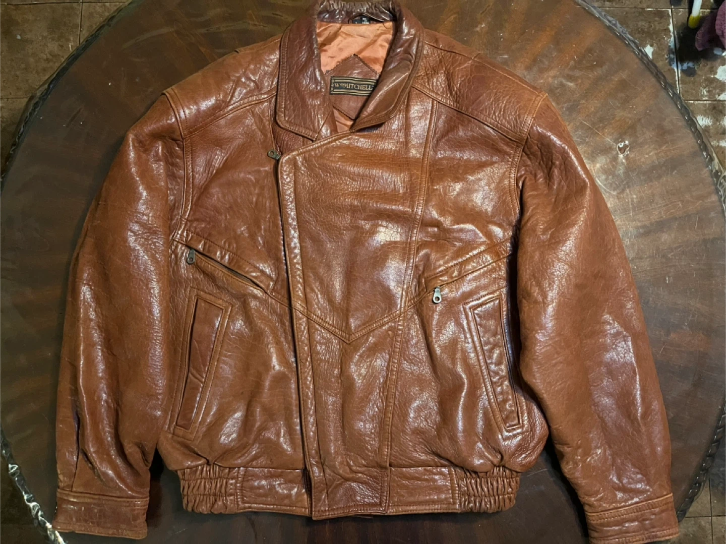 15This Men's Light Brown 90's Vintage Genuine Leather Bomber Jacket by Wm Mitchell is a stylish and classic choice for casual occasions. Made with high-quality leather and featuring a regular fit, this jacket is perfect for the winter, fall, and spring seasons. The distressed details and zip closure add a touch of retro flair, making it stand out with a vintage 90's theme. Whether you're looking to add a touch of leather to your wardrobe or simply want to add a unique piece to your collection, this bomber jacket is sure to make a statement.