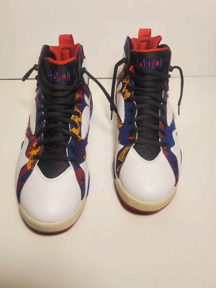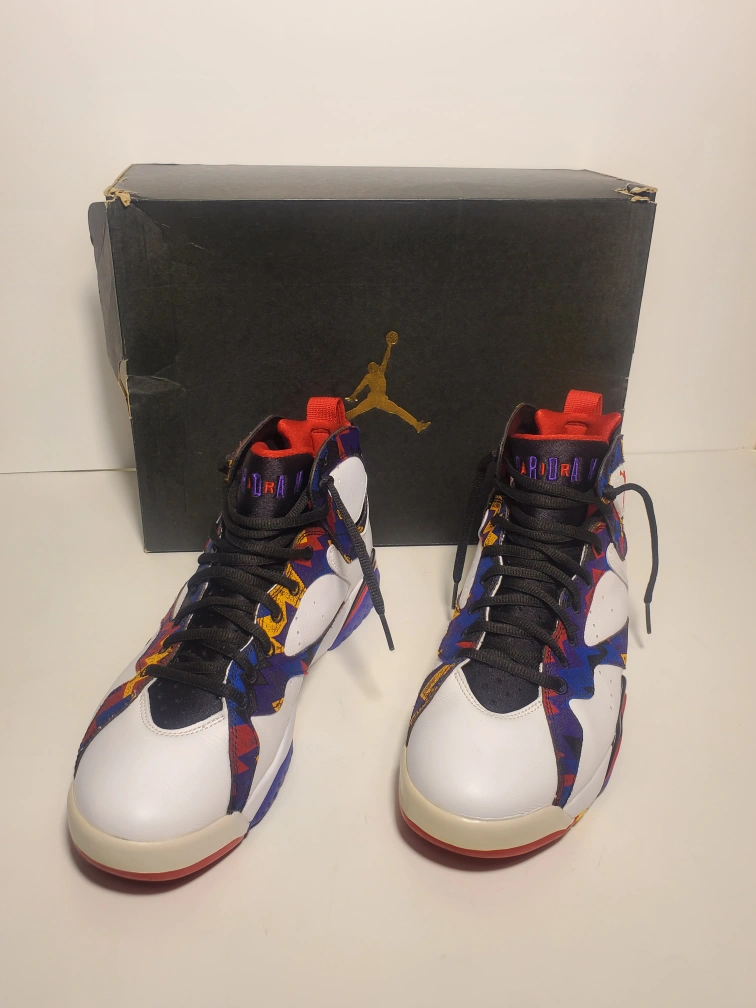 Pre-Owned Men’s Jordan 7 Retro Nothing But Net With Box 304775-142 Size 9.5 Brand: Jordan Color: Blue, Red, White, Black Size: 9.5 Style Number: 304775-142 Comes With Original Box Little creasing on the fronts Yellowing in the front Couple markings on the top of shoe, a good cleaning will due The bottom soles show wear, a good cleaning for the soles all around Please see pictures for imperfections Good Condition