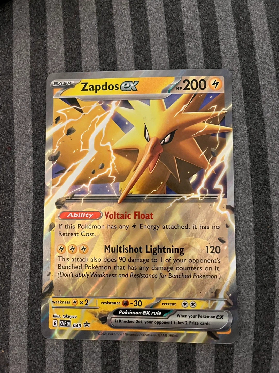This is a Zapdos EX trading card from Pokemon. It has 200 HP and its 'Voltaic Float' ability allows it to have no Retreat Cost. Its 'Multishot Lightning' attack deals 120 damage.