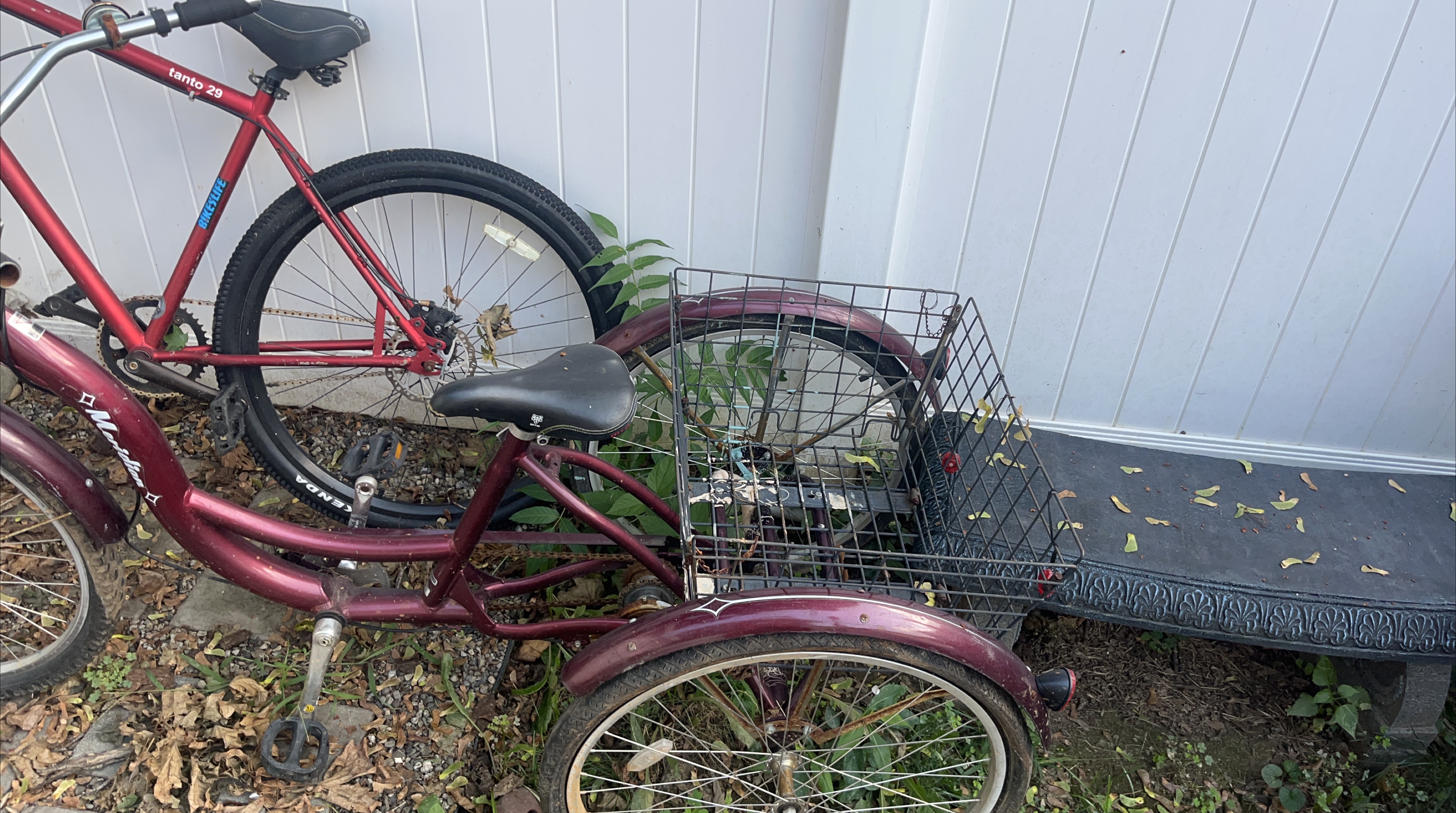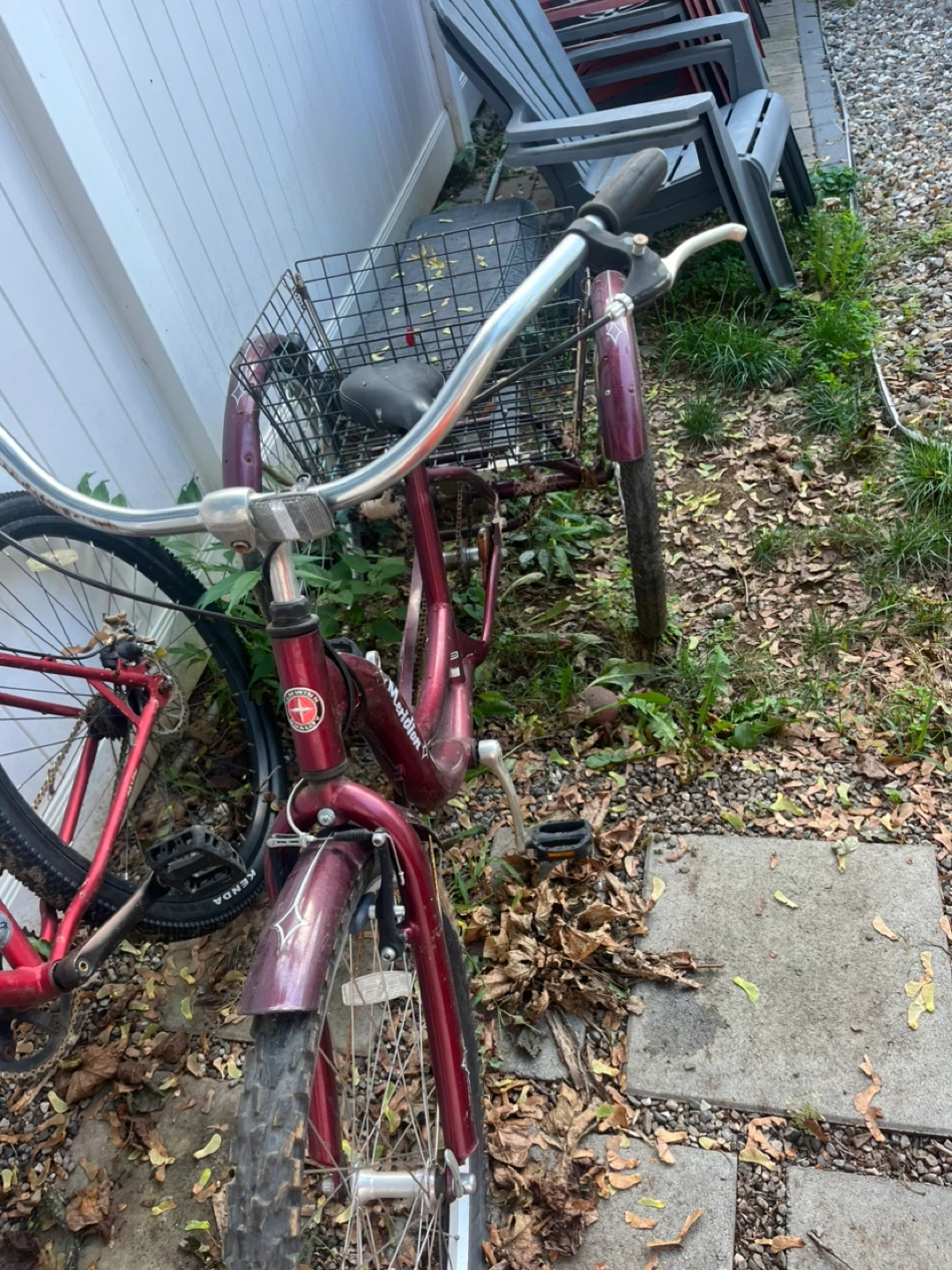 Selling a burgundy Meridian adult tricycle. It has a basket in the back, perfect for carrying groceries or other items. It shows some signs of use.