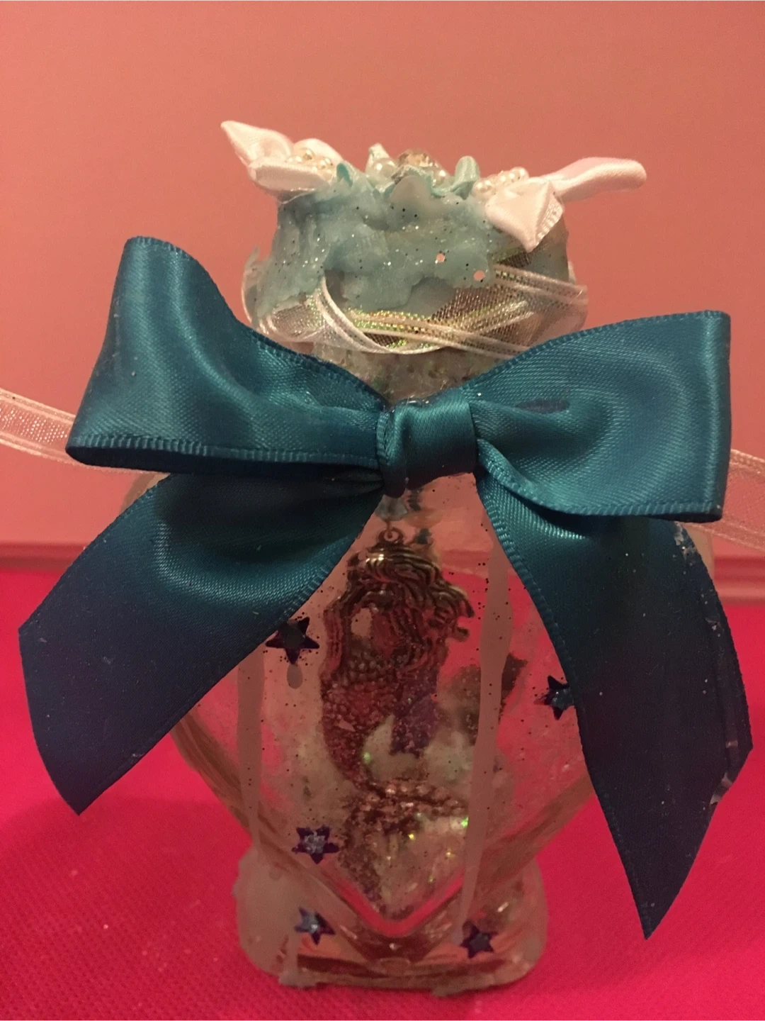71This is a beautiful mermaid snow glitter jar decoration! It features a silver mermaid inside a heart-shaped glass jar filled with glitter and stars. The top is decorated with blue and white flowers and a teal ribbon. It's a unique and charming piece to add to any room!
