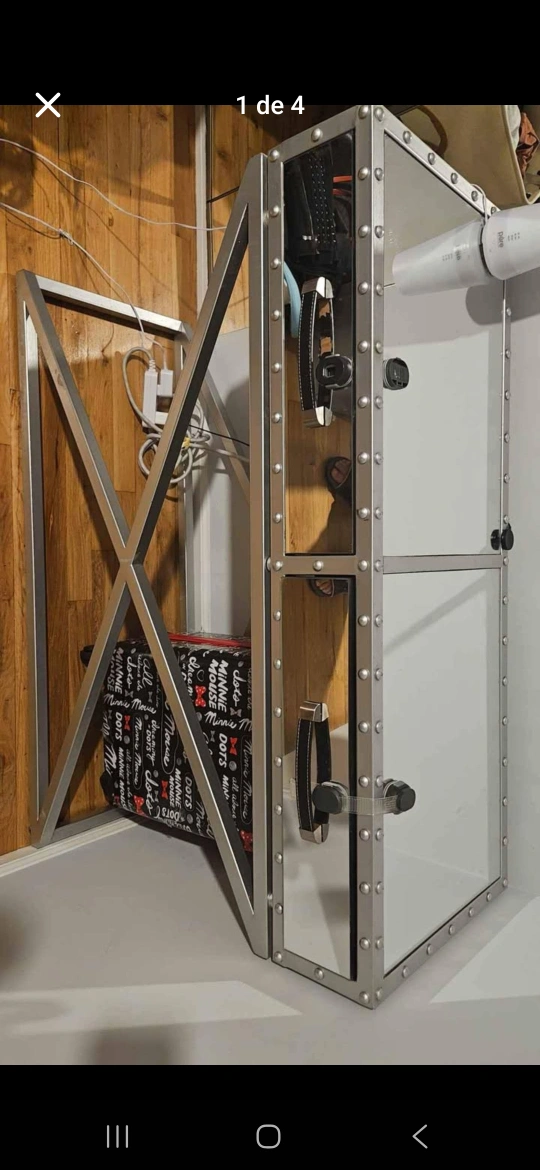 10Selling a silver metal and glass cabinet. It has a unique industrial look with visible rivets and handles. The cabinet features glass doors and a metal frame. Perfect for adding a modern touch to your space!