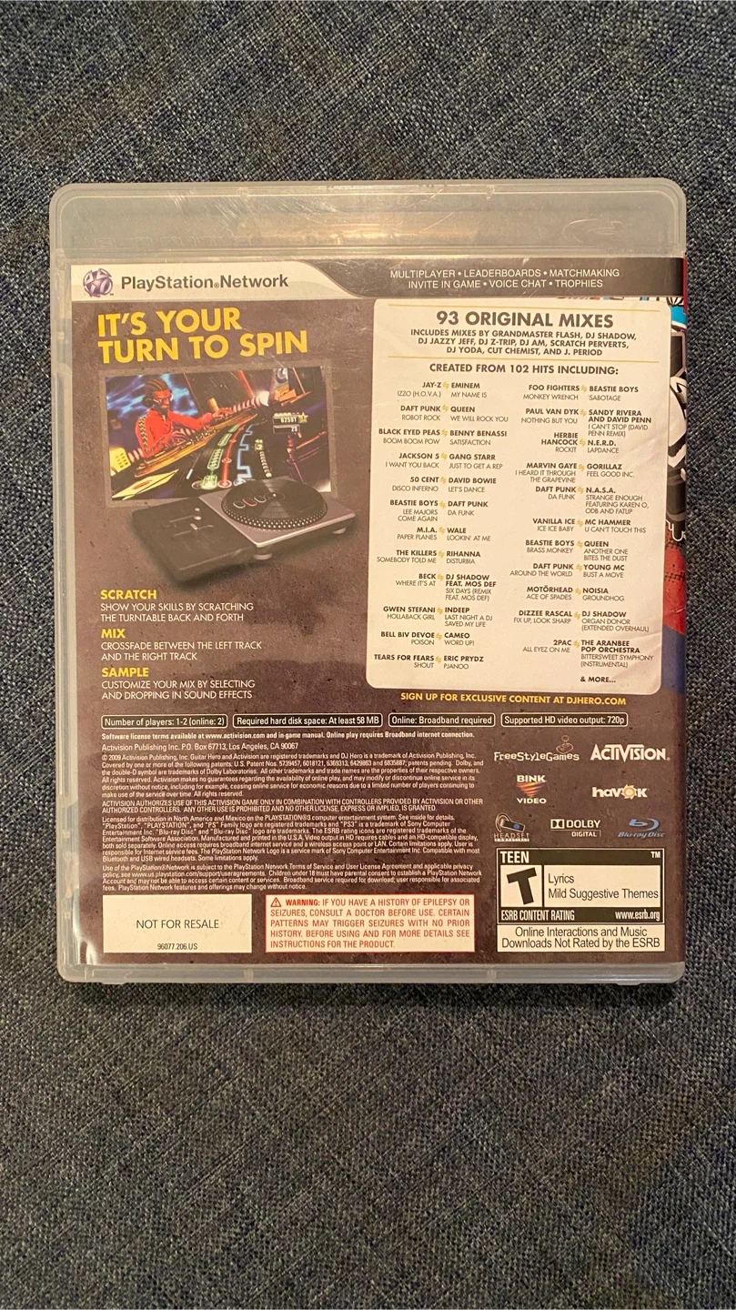 DJ Hero for PS3 includes 93 original mixes featuring 100 of the hottest artists. Learn to scratch and mix tracks! This game has 0-2 players online and requires at least 50 MB of hard disk space. Supports HD video output.
