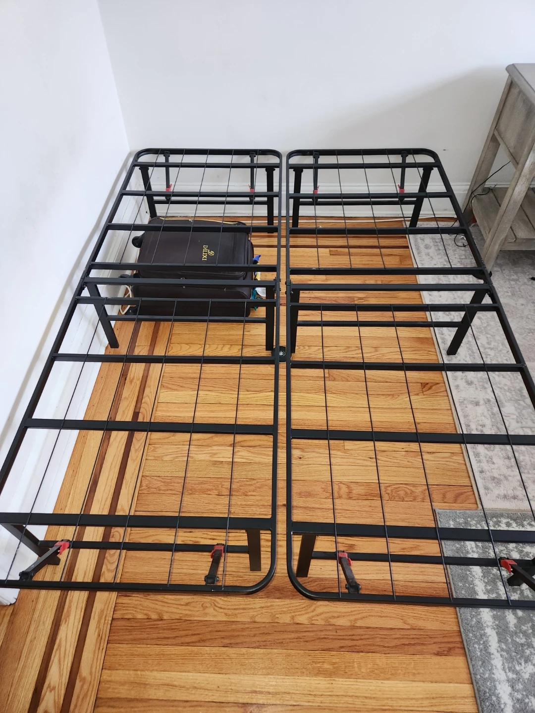 This is a black metal bed frame. It's designed to support a mattress without a box spring. Includes legs that fold for easy storage.